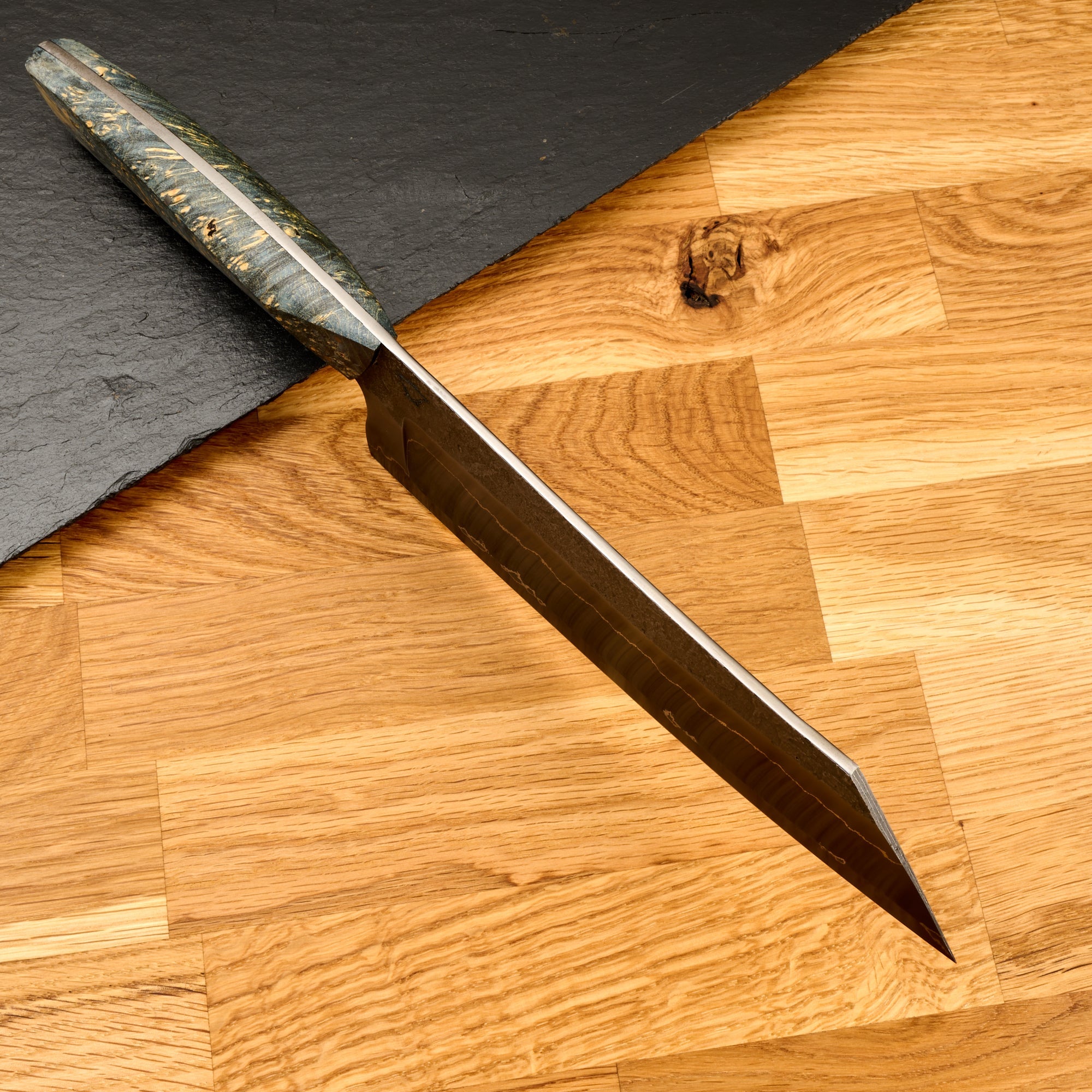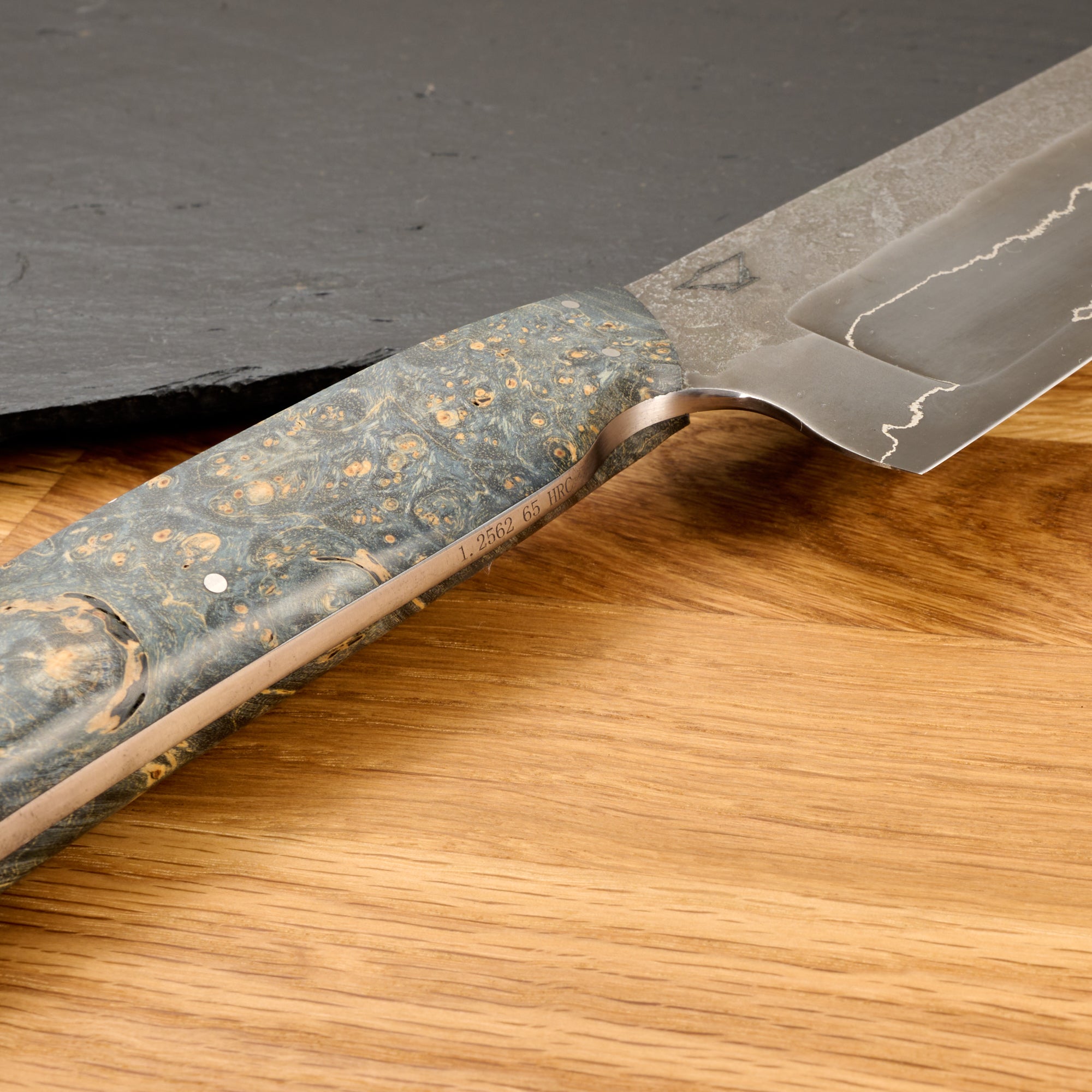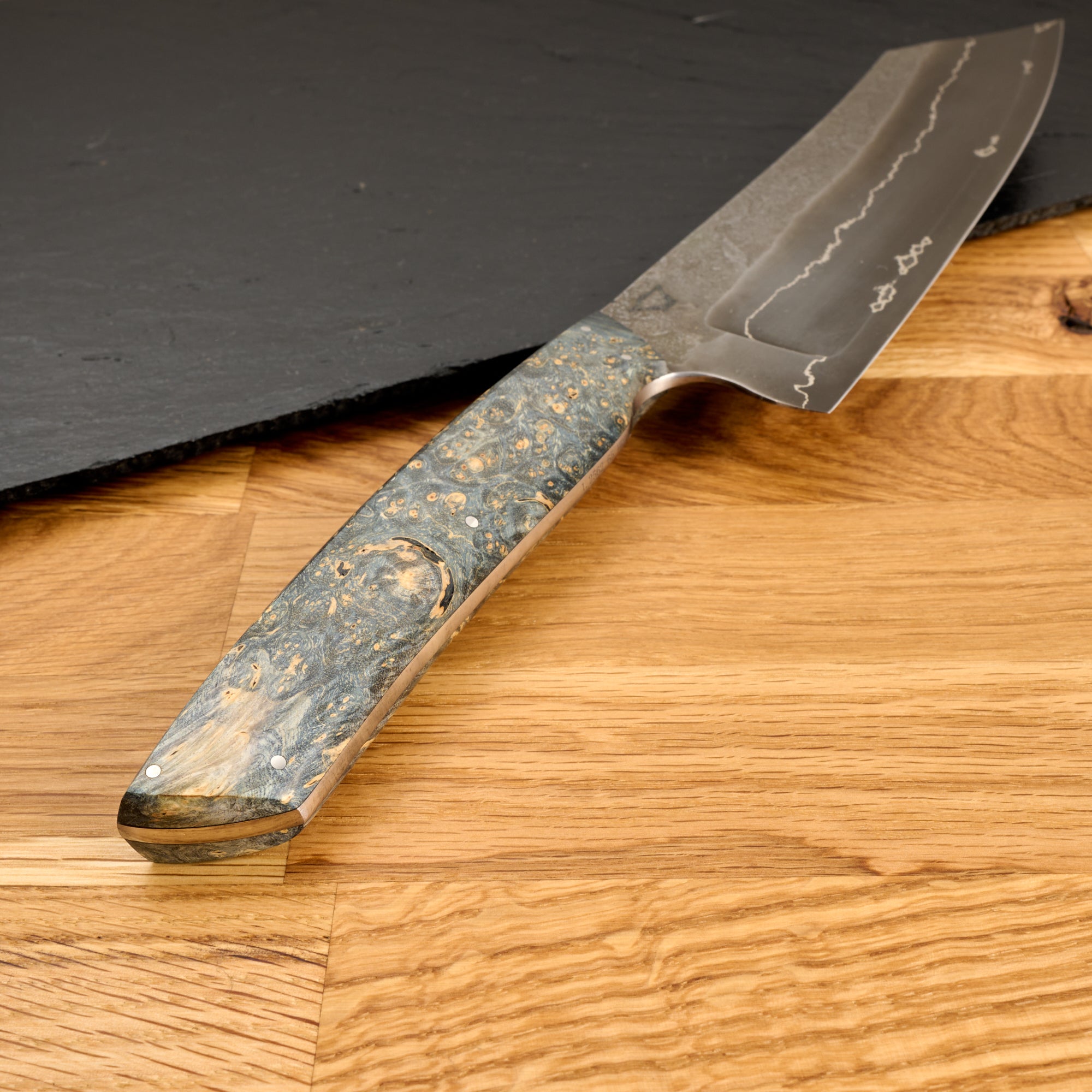 Die Klinge, geschwärzt und satiniert, sieht fantastisch aus. Drei Lagen deutscher Premium-Werkzeugstahl 1.2562 werden durch eine Nickelscheibe getrennt, die für einen markanten Kontrast sorgt. Beim Griff nach hinten finden wir eine sehr geschmackvolle stabilisierte Maserpappel, die in natürlichen Blau- und Cremetönen gefärbt wurde. Die Maser hat eine schöne Figur und ist voller Augen, es ist umwerfend!