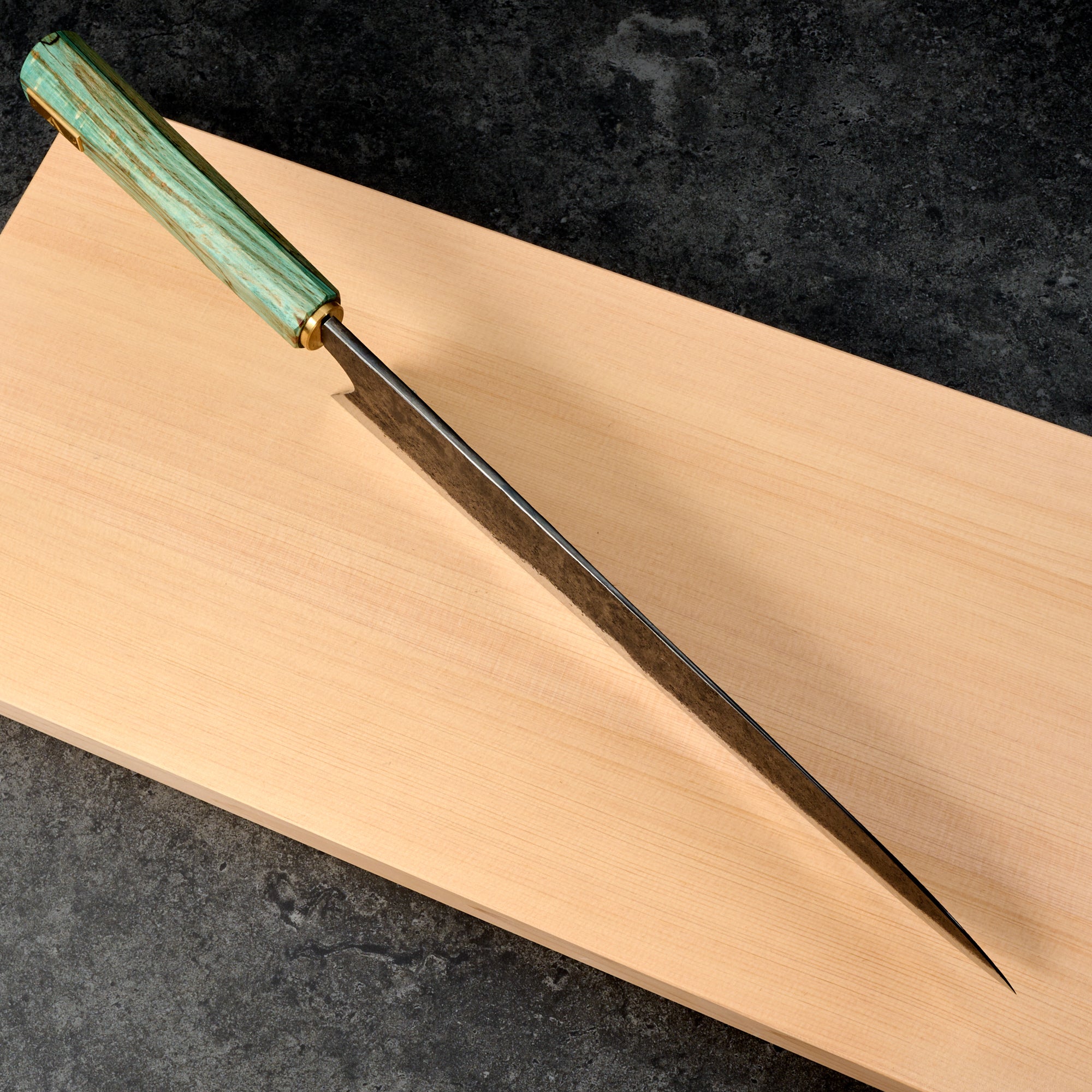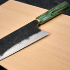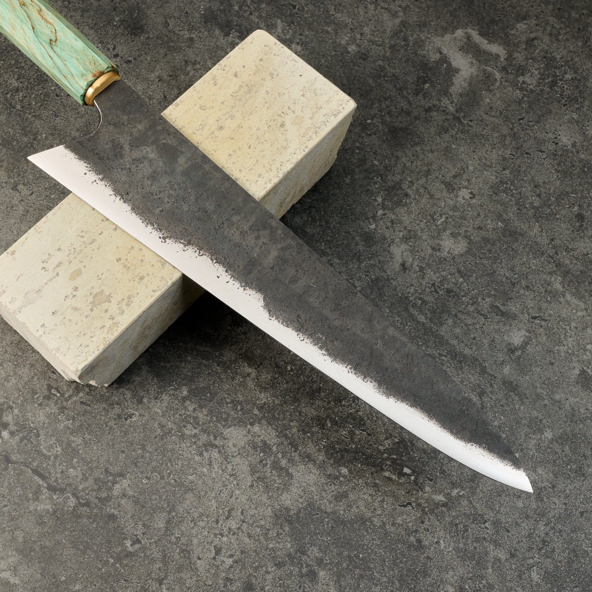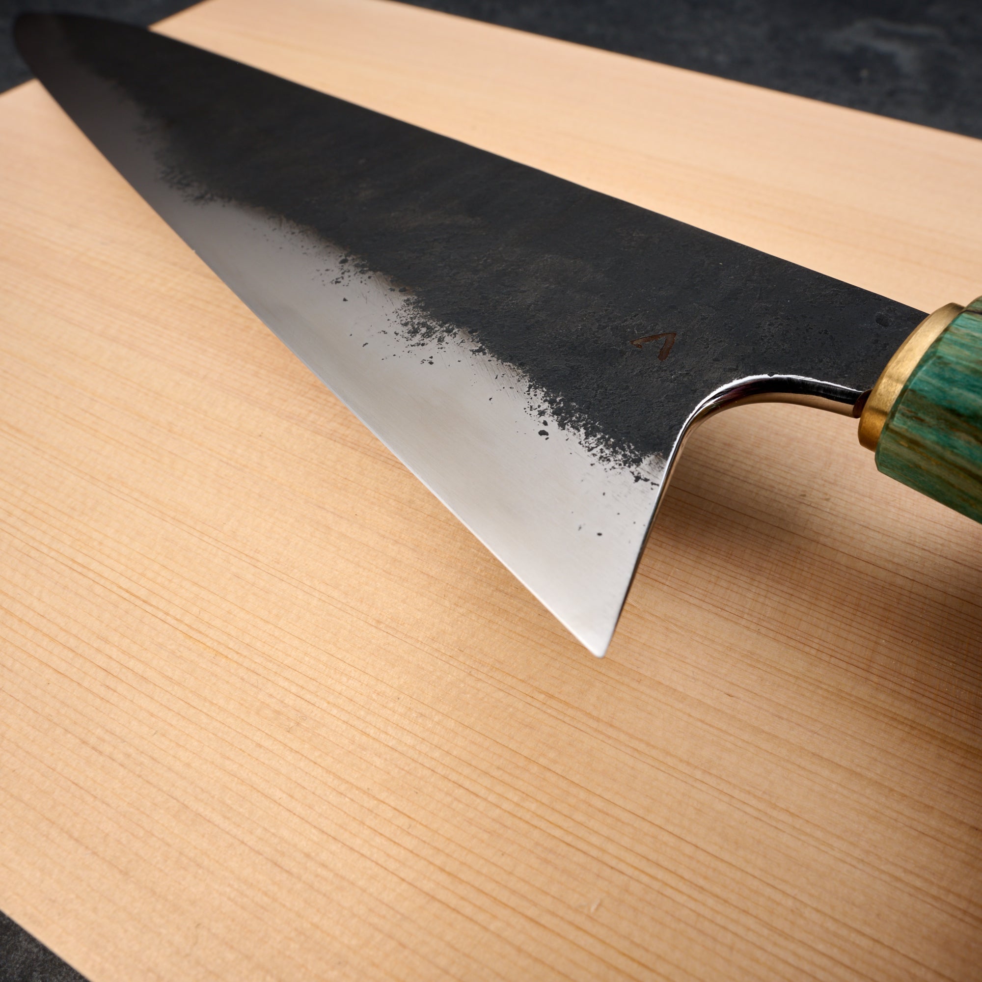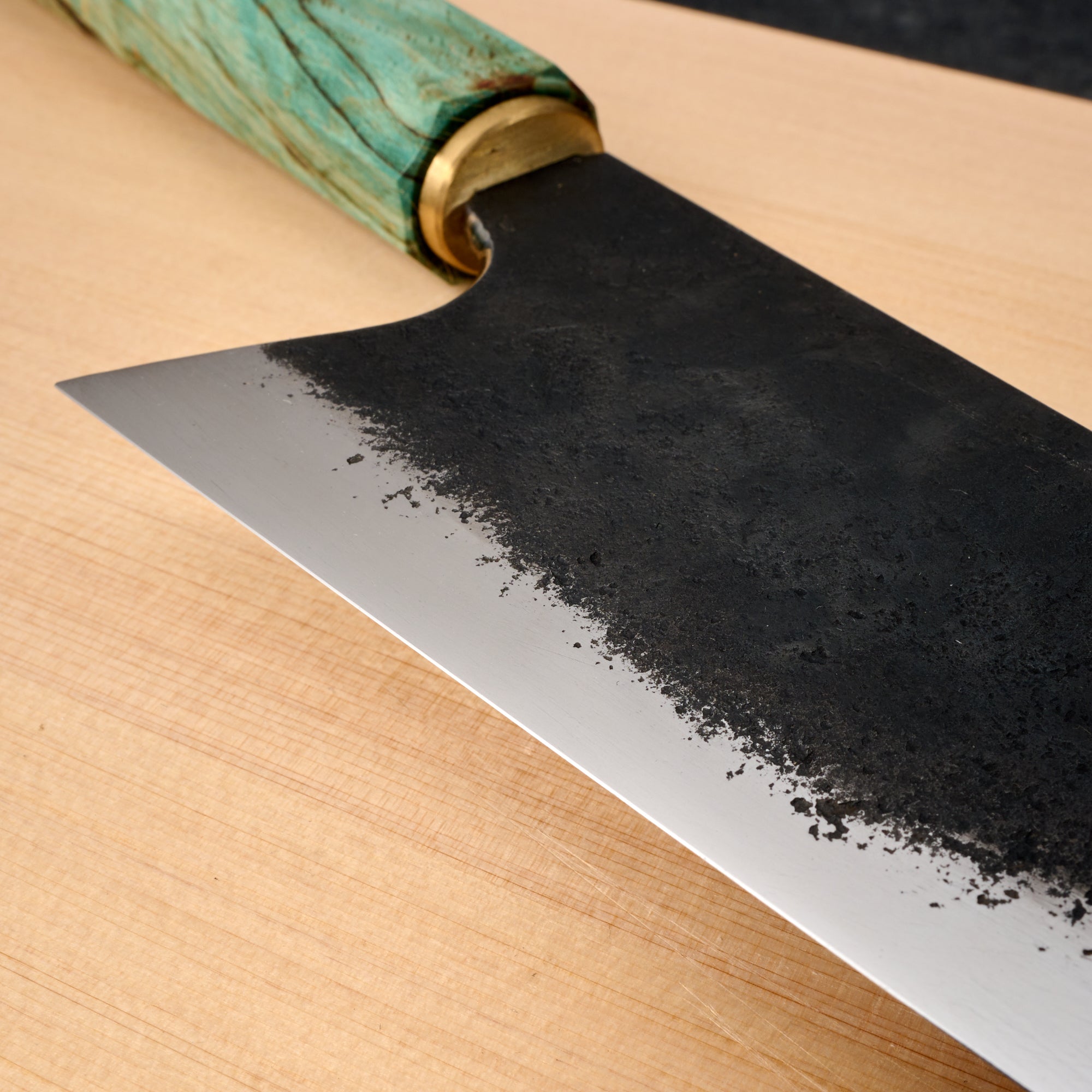A classic Adonis Forged Arts, octagonal handle with brass bolster and name plate completes the knife. The handle is made of a house favourite, dyed and stabilized spalted beach, which gives the knife a classic Adonis forged arts contemporary look and pairs beautifully with the black kurouchi finish.