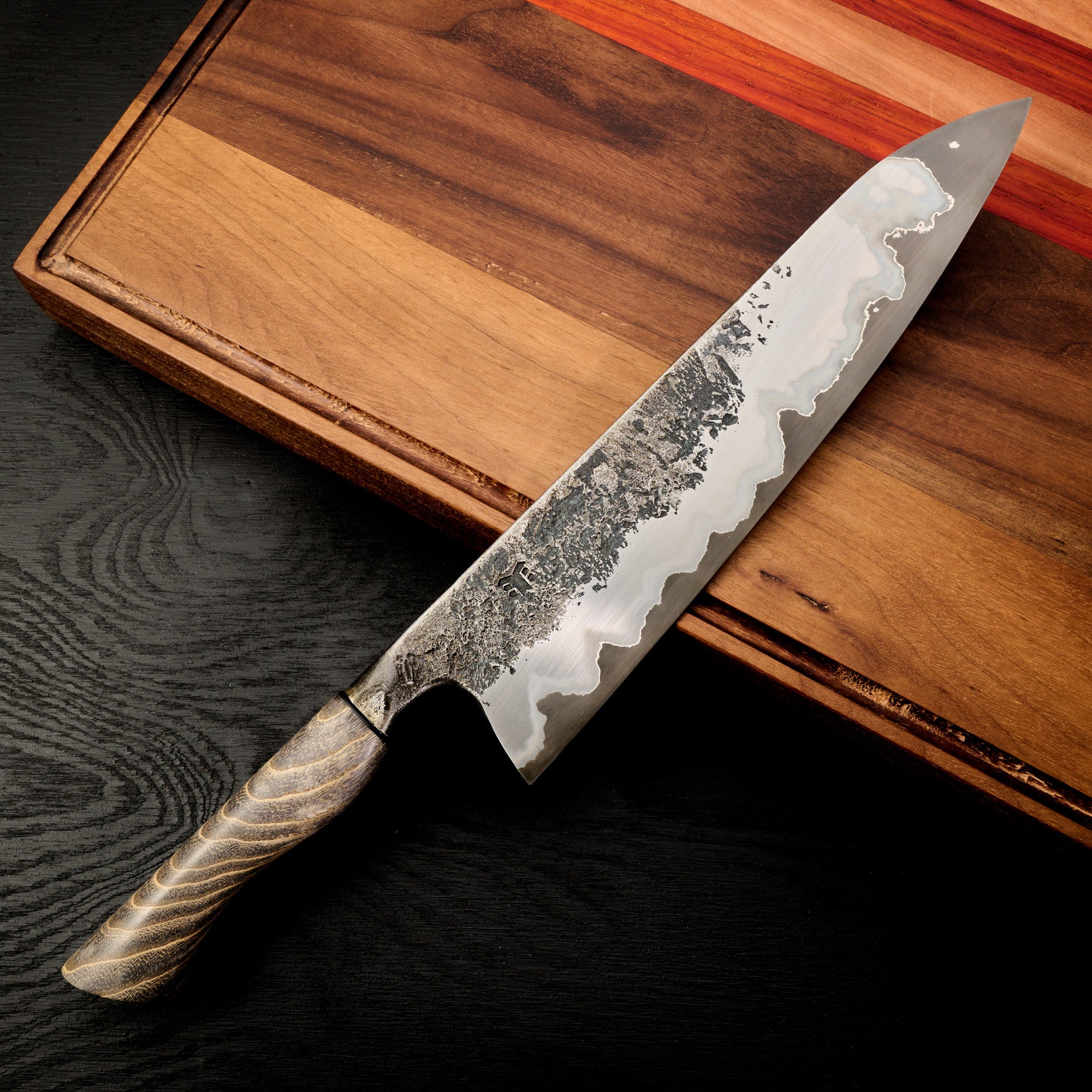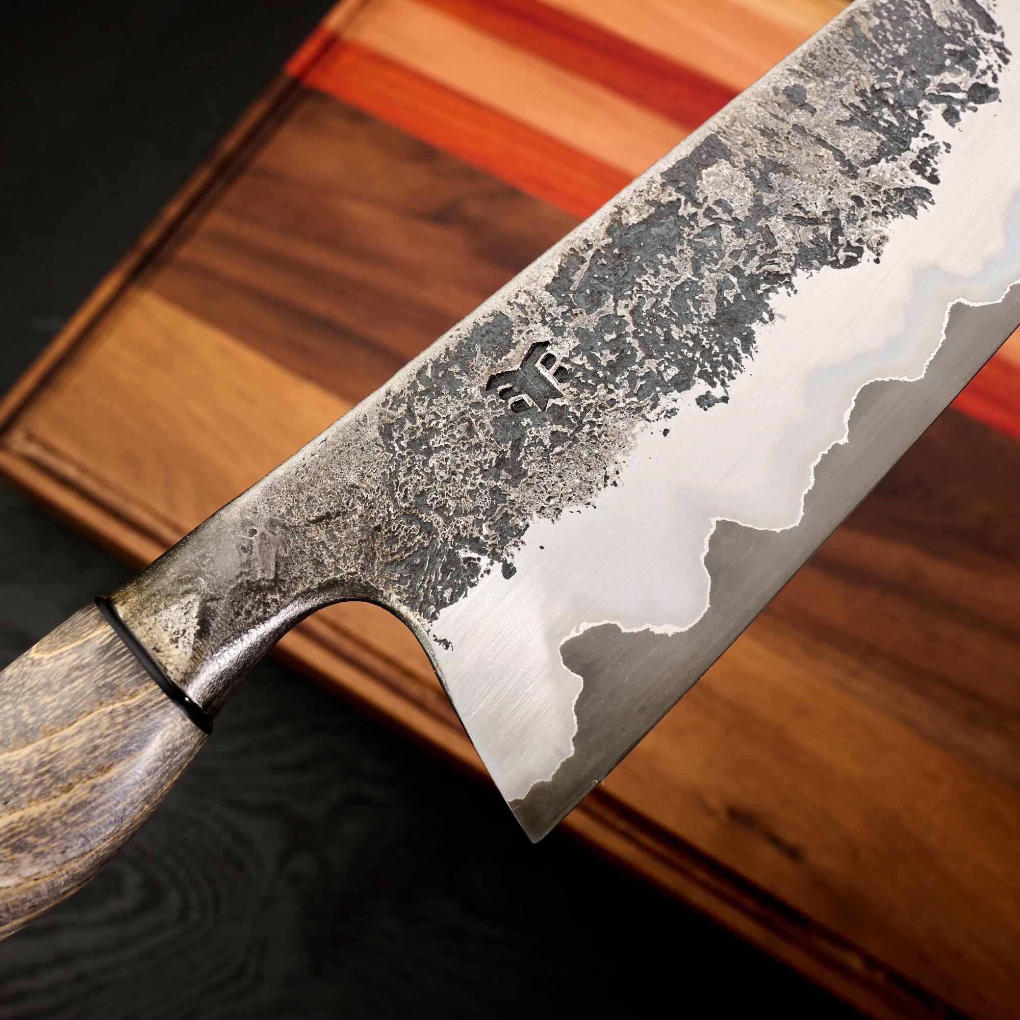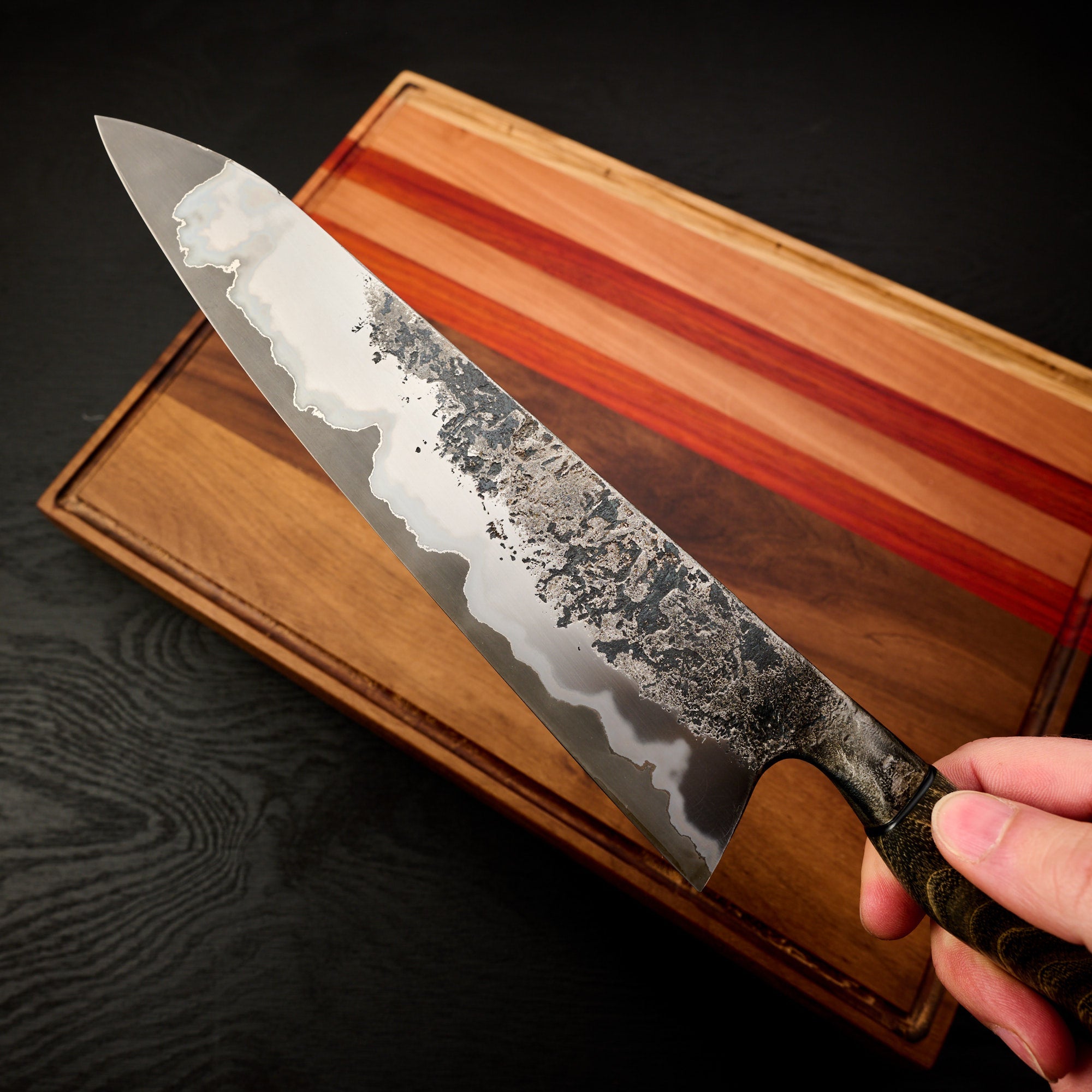 Blade Finish: Brute de Forge, Acid Etched (Forced Patina), and Satin Polish