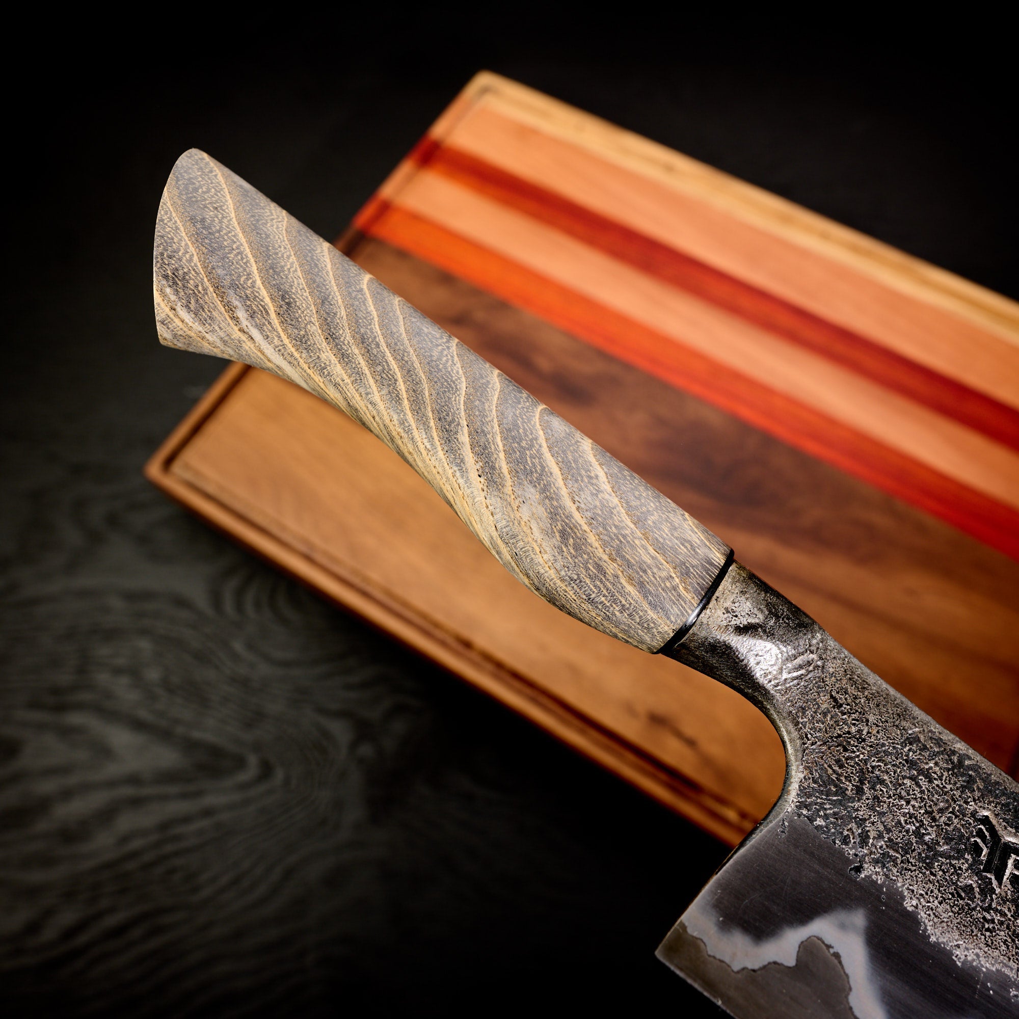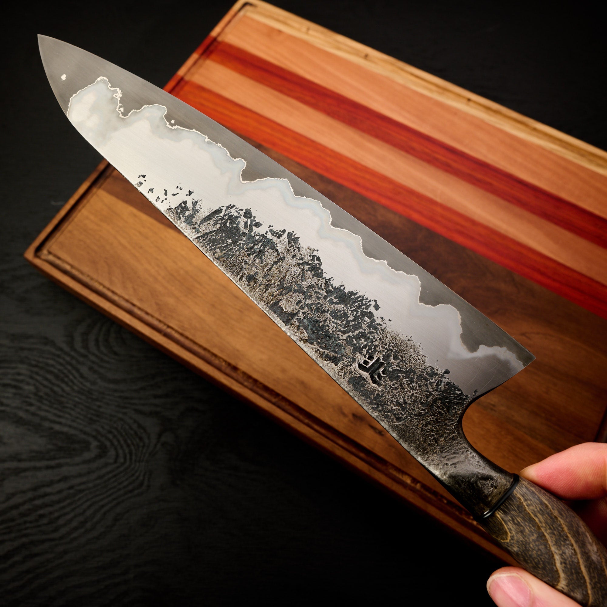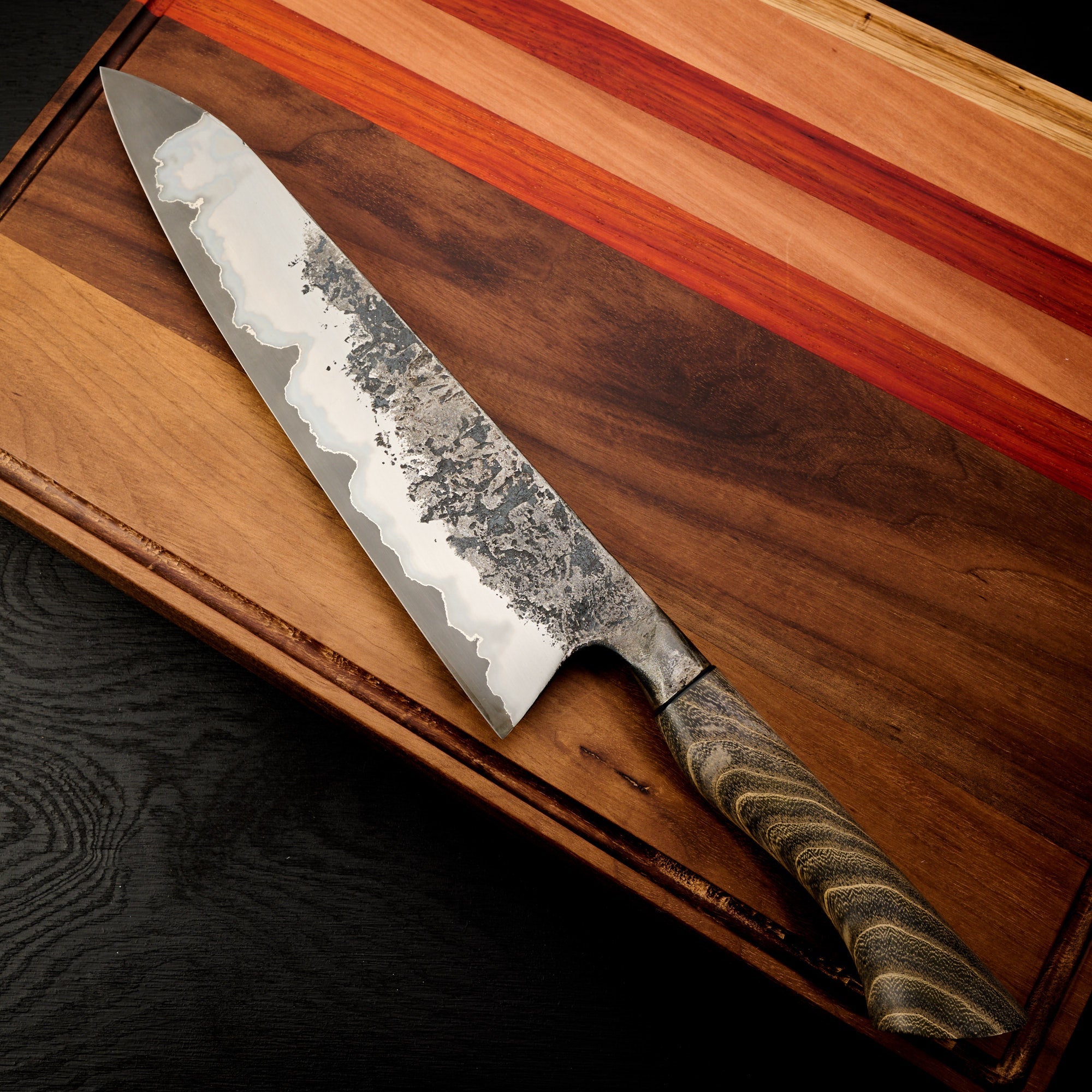 Blade Finish: Brute de Forge, Acid Etched (Forced Patina), and Satin Polish