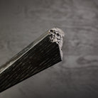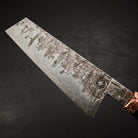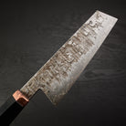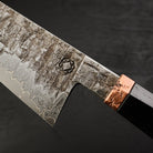 The Bunka 155mm is a very classy, and nimble blade. With stunning, signature madebykary's features like his brutalist inspired textures and hand carved bolster and pommel. The handle is crafted in stabilized ancient bog oak and copper. The combination is edgy, dark and very cool.