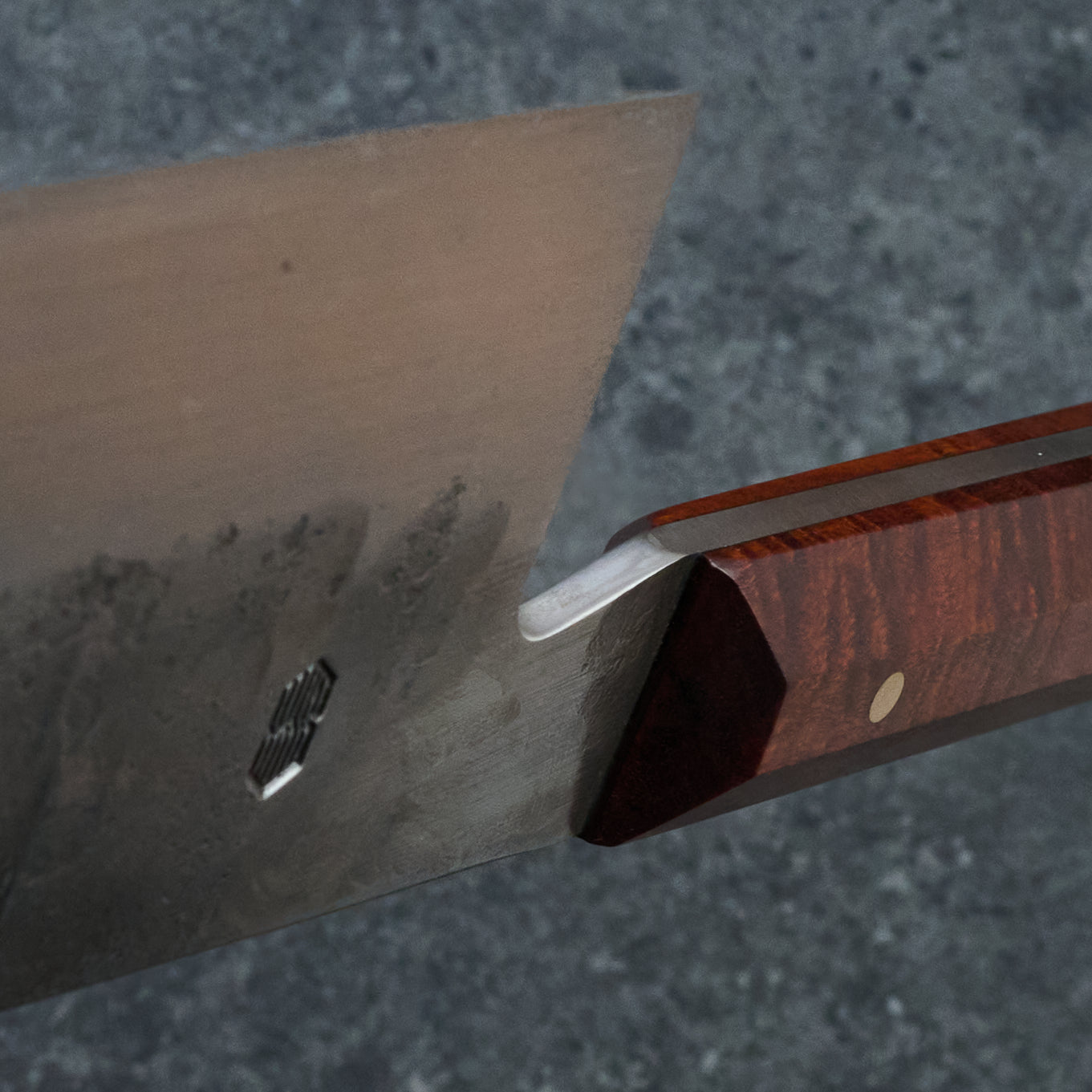 This remarkable knife is the result of a creative collaboration between Timo Verschuren of Hardent Knives and the MCX design studio. Forged in Timo's studio in Maastricht, Netherlands, the knife represents a harmonious blend of traditional craftsmanship and modern design aesthetics. Inspired by the highly regarded Masamoto KS, the blade profile retains the elegance of its Japanese counterpart while introducing unique modifications. Featuring an aggressive distal taper and finely crafted convex bevels, the geometry delivers exceptional performance on the cutting board. The slightly taller blade height enhances versatility without sacrificing agility, making it a nimble yet powerful tool.