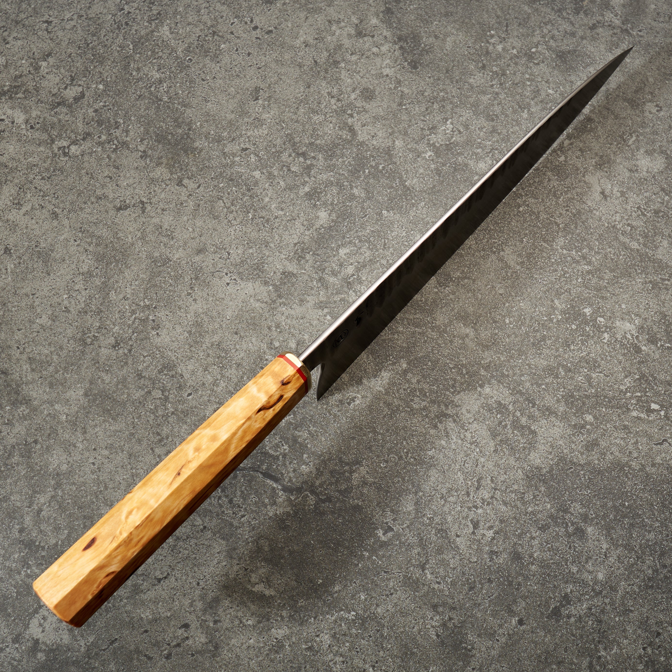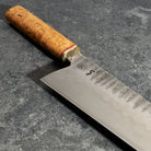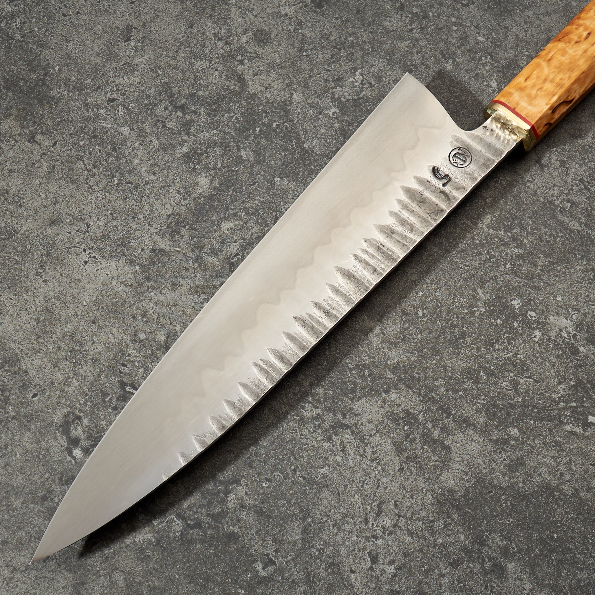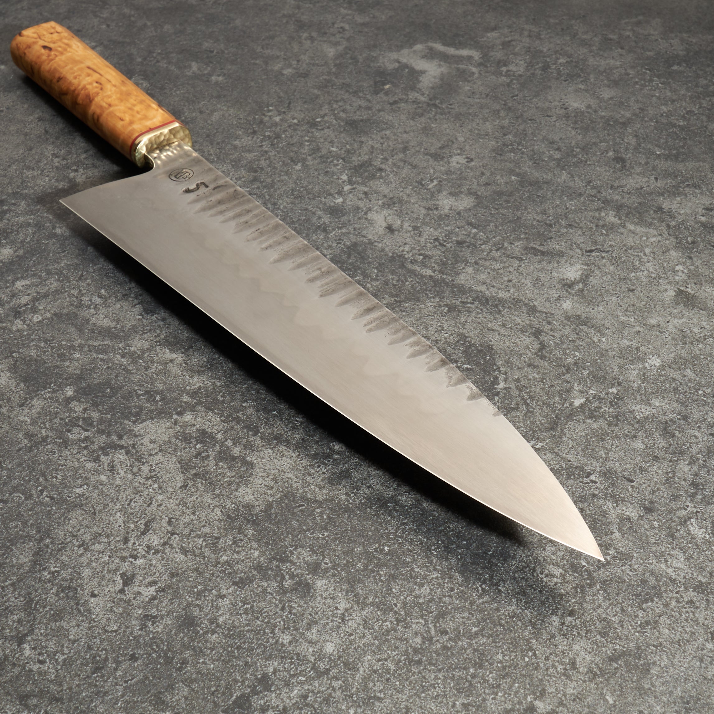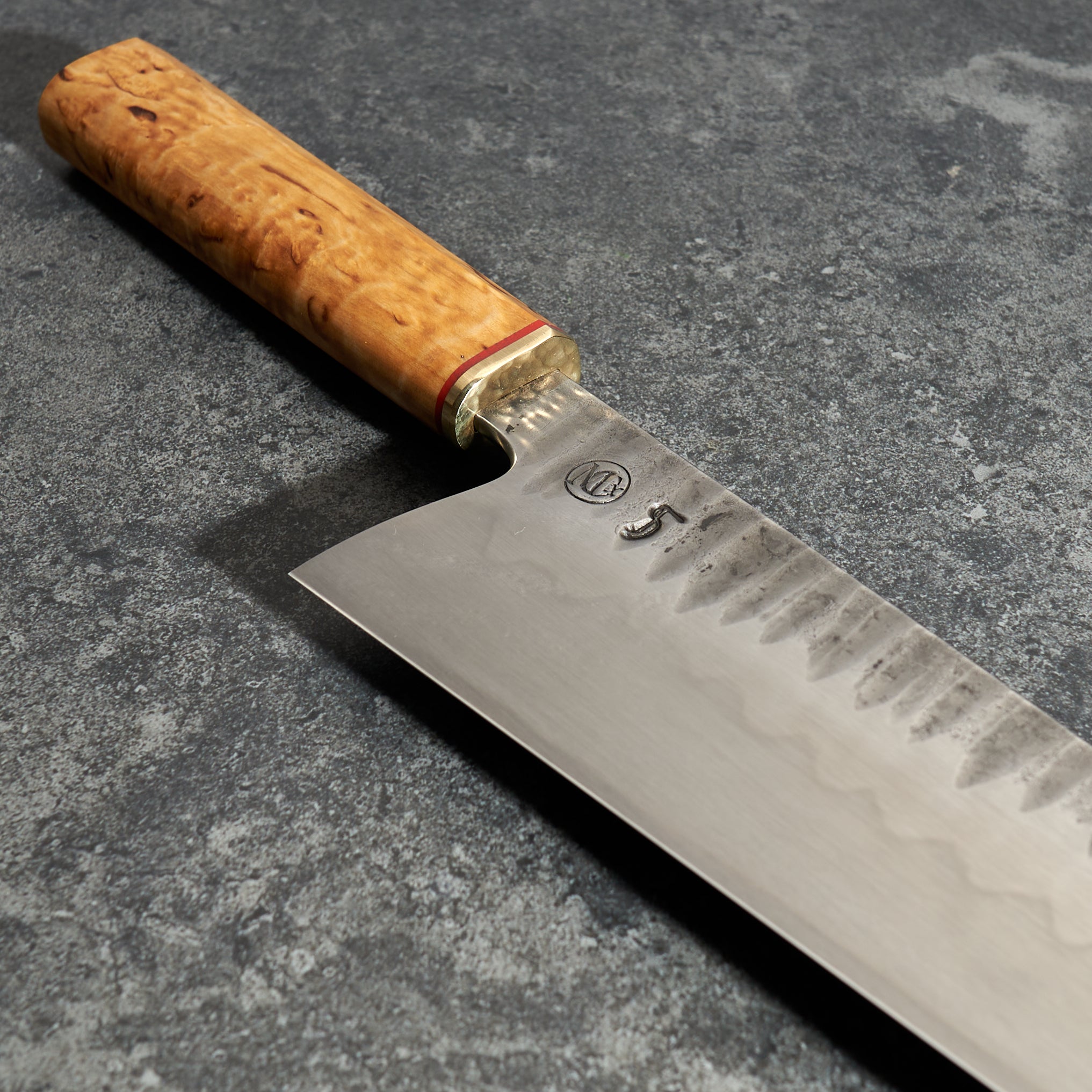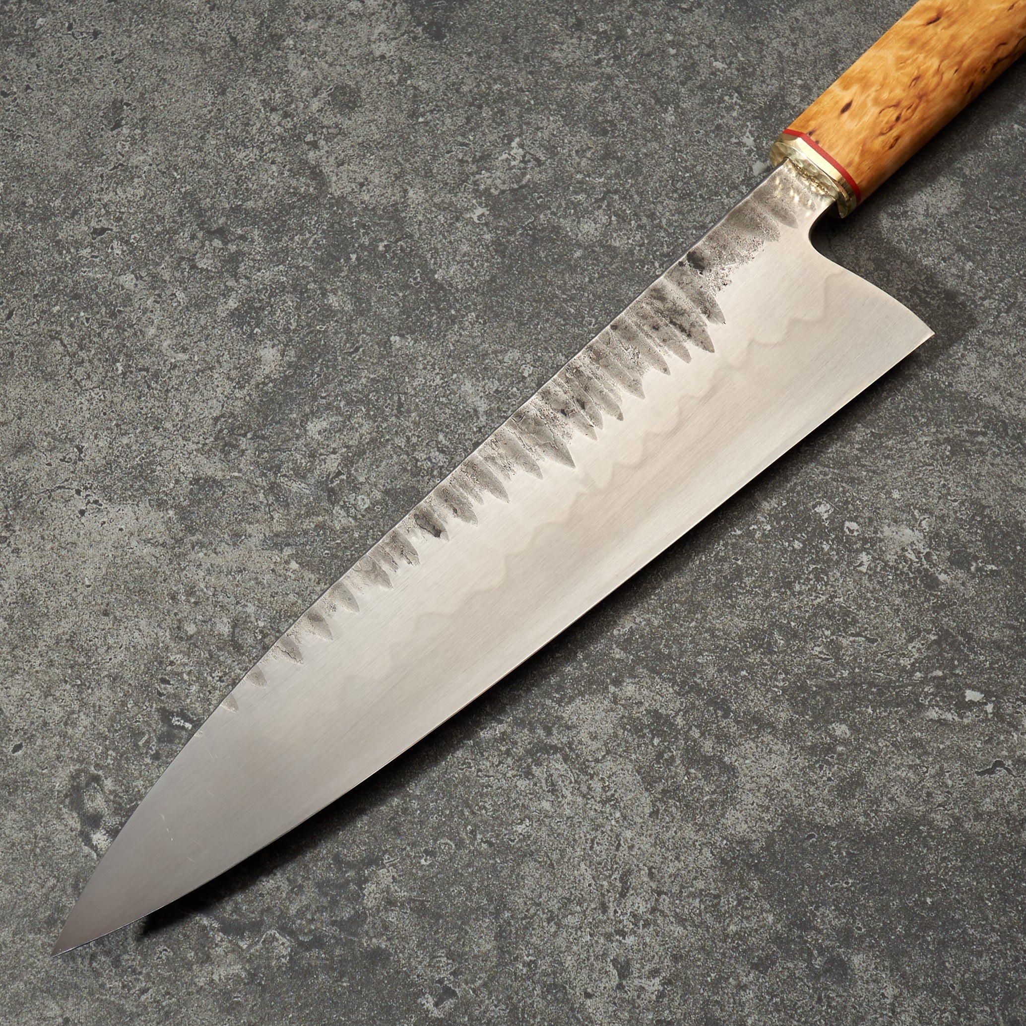 Handle Materials: Masur Birch with G10 Spacer & Hammered Brass Bolster