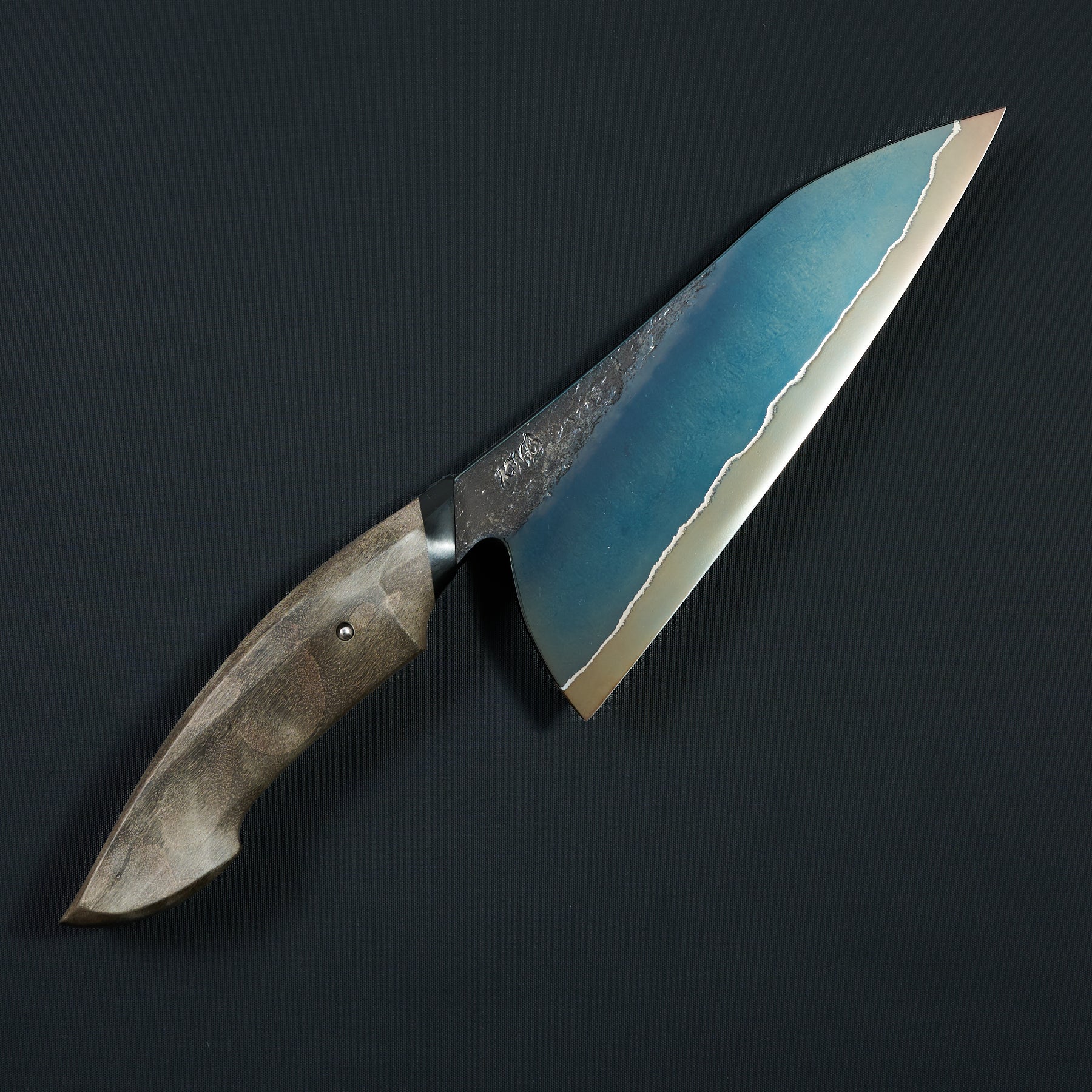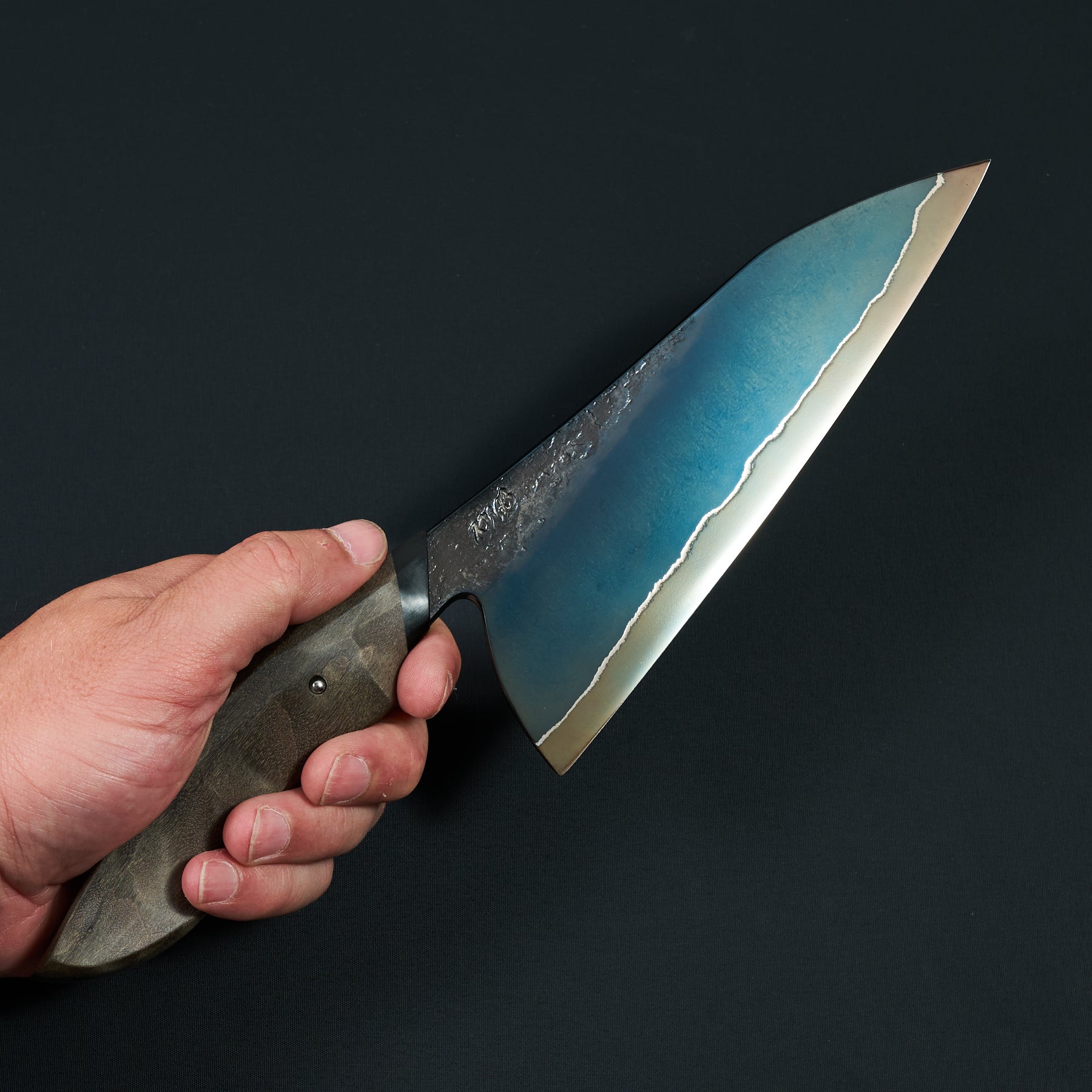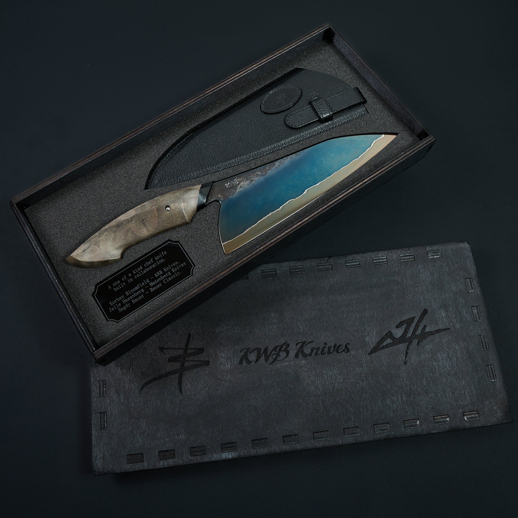 This one-of-a-kind handmade kitchen knife represents a collaborative work of craft and intention by artisanal makers Jelle Hazenberg and Korban Bloomfield. Built around a contemporary interpretation of the Japanese santoku, the blade carries a thick, lightly tapered spine that provides strength through the cut while maintaining a fluid, agile forward motion. Forged in Apex Ultra clad in 80CrV2, the blade features a five-layer go-mai construction with Brute de Forge texture, an acid-etched forced patina, and refined mirror-polished details—an aesthetic and functional expression of the makers’ deep understanding of steel and geometry.
