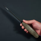 The wide convex bevels define the knife’s performance identity, offering excellent food release and a confident, adaptable cutting feel. Neither a featherweight laser nor a heavy workhorse, it occupies a purposeful middle ground that excels across a wide range of produce—from dense root vegetables to more delicate ingredients. With 190 mm of cutting edge, a height of 65 mm, and a spine that transitions from 3.93 mm at the heel to 2.2 mm before transitioning to the fine tip, the knife balances robustness with nimbleness. At 214.9 g, it moves with precision and stability, delivering a cutting experience that feels intuitive and controlled.