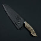 The removable hidden-tang handle brings both utility and visual warmth, crafted from dyed and stabilised Quilted Maplewith an acrylic bolster and engineered for take-down maintenance. Complementing the knife is a handcrafted leather sheath by Magdy Richard Bauer, made from Alran Sully goatskin with a waxed interior, Meisi fine linen thread, and meticulously polished edges. Presented in its dedicated display box, this piece stands as a singular fusion of design, material mastery, and artisanal intent—equally at home in a working kitchen or as a centrepiece in a curated collection.
