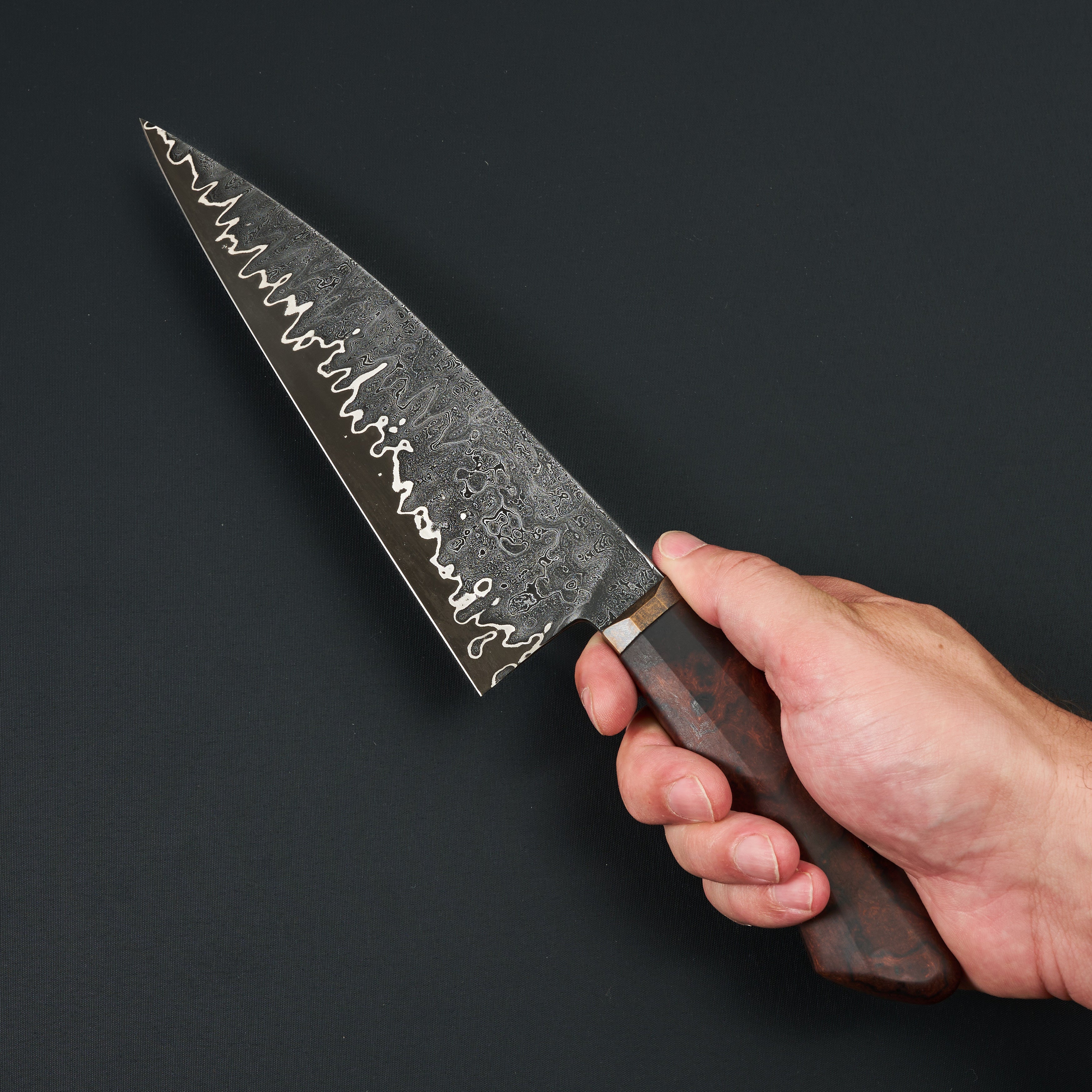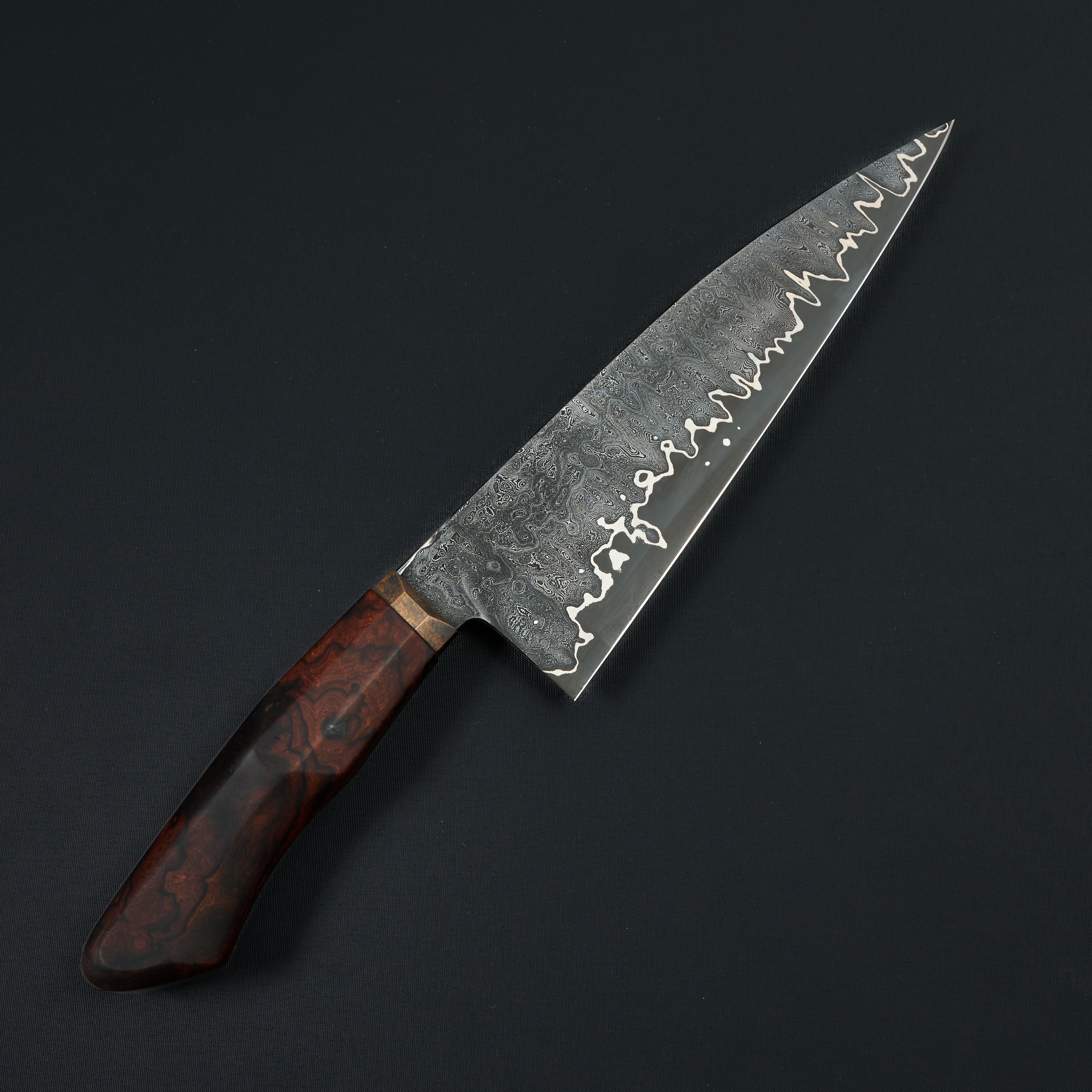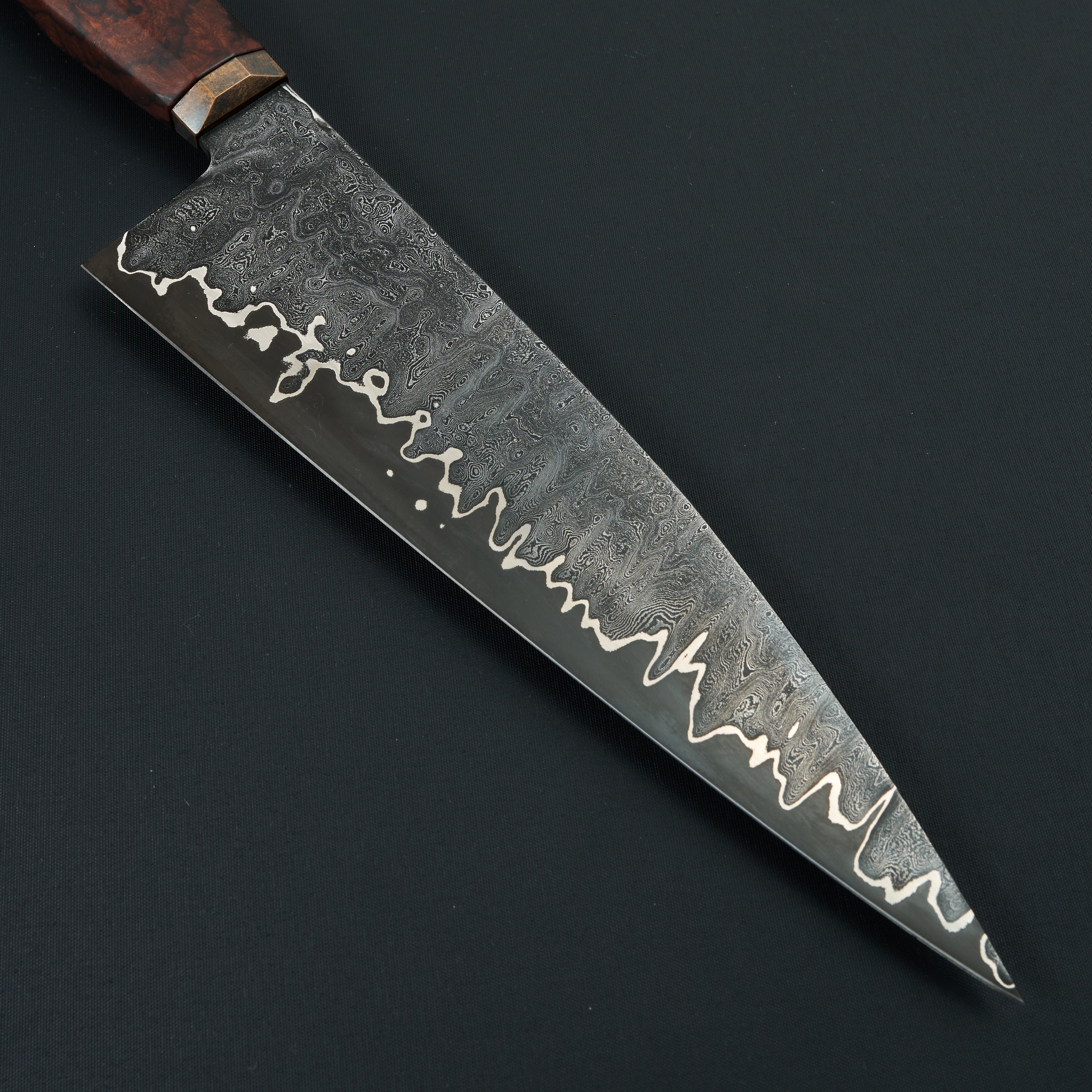The handle is a western-influenced, ergonomically faceted design built for real kitchen use. Crafted from dense desert ironwood and paired with a patinated bronze bolster, the handle offers comfort in both hammer and pinch grips. Subtle shaping and balance give the knife a feeling of robustness without heaviness—nimble, responsive, and composed in hand. This Paragon Series piece is not merely a tool, but a complete, resolved object: balanced, expressive, and unmistakably individual.
