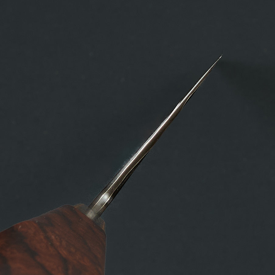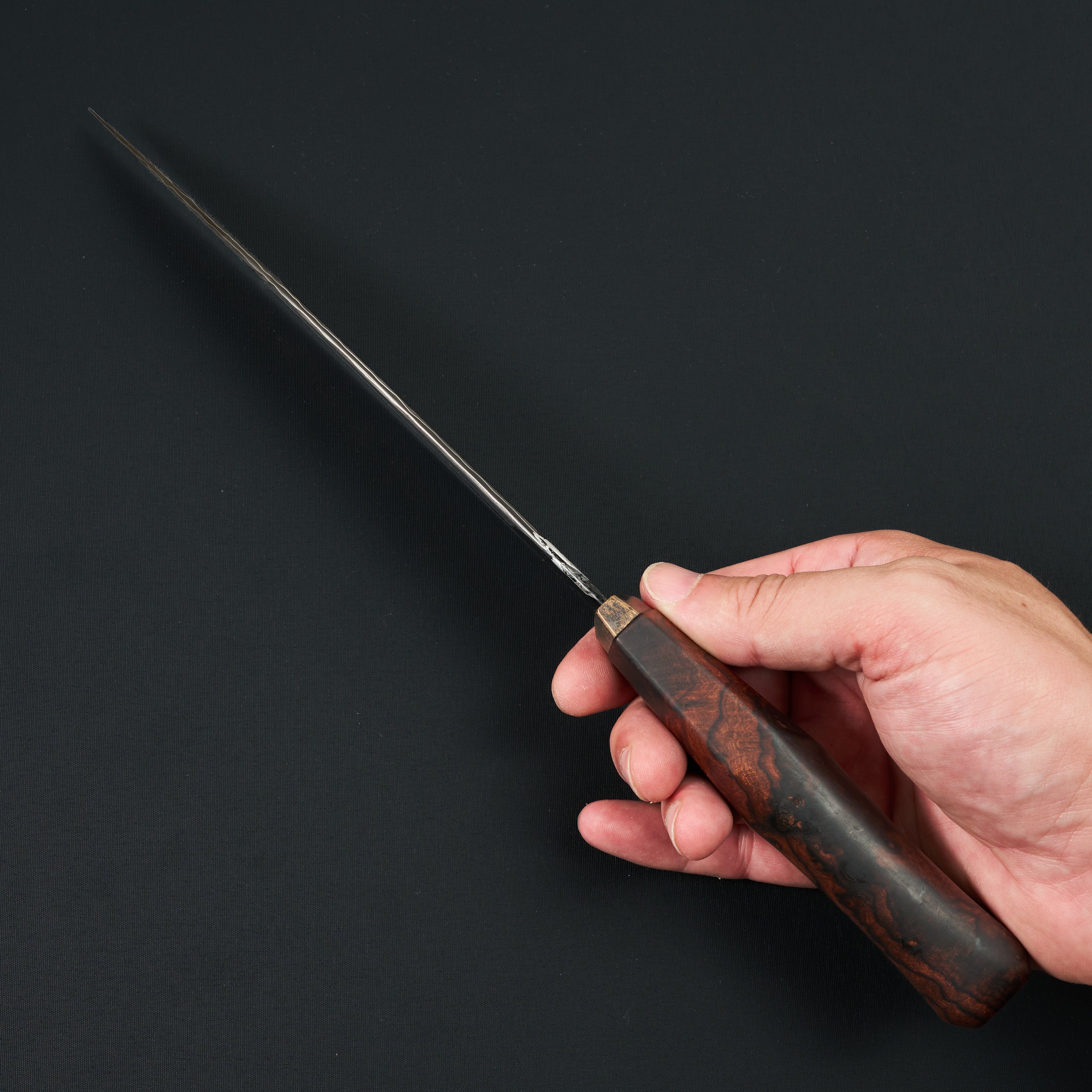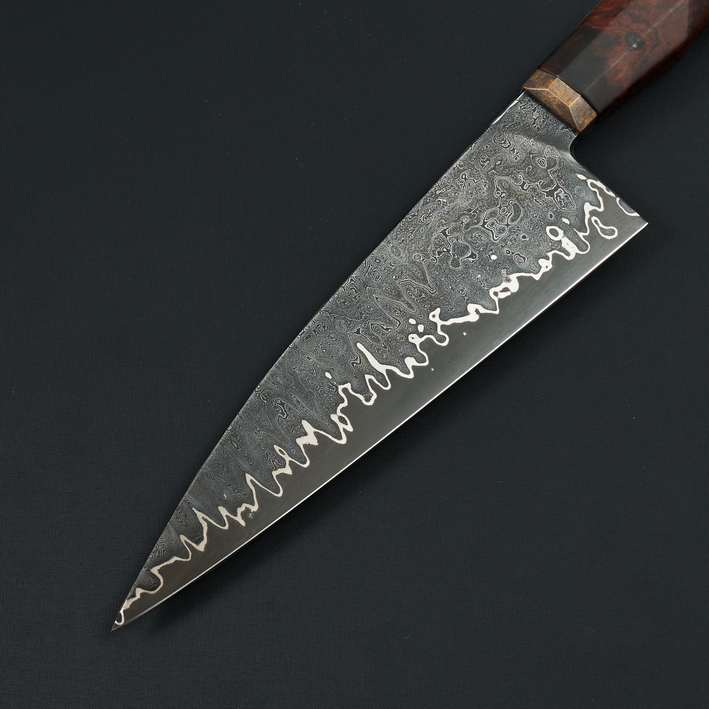 The handle is a western-influenced, ergonomically faceted design built for real kitchen use. Crafted from dense desert ironwood and paired with a patinated bronze bolster, the handle offers comfort in both hammer and pinch grips. Subtle shaping and balance give the knife a feeling of robustness without heaviness—nimble, responsive, and composed in hand. This Paragon Series piece is not merely a tool, but a complete, resolved object: balanced, expressive, and unmistakably individual.