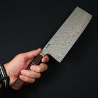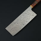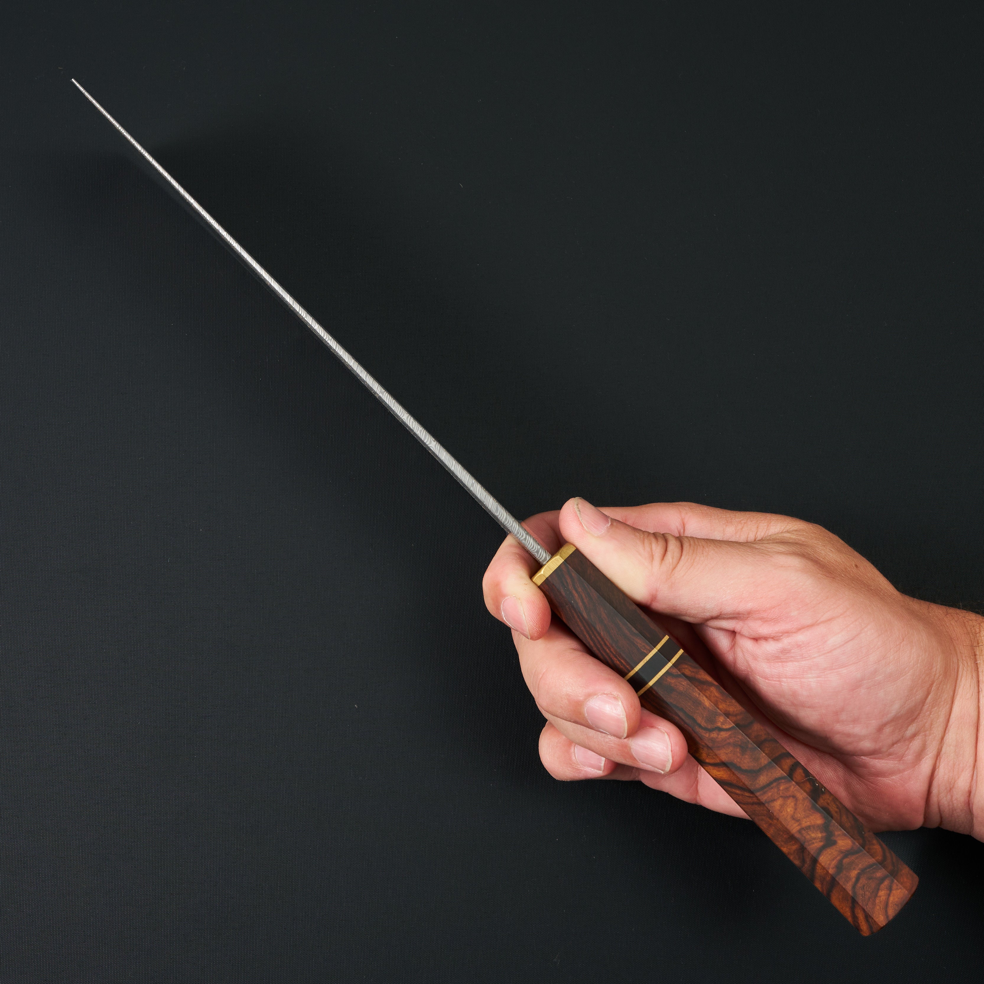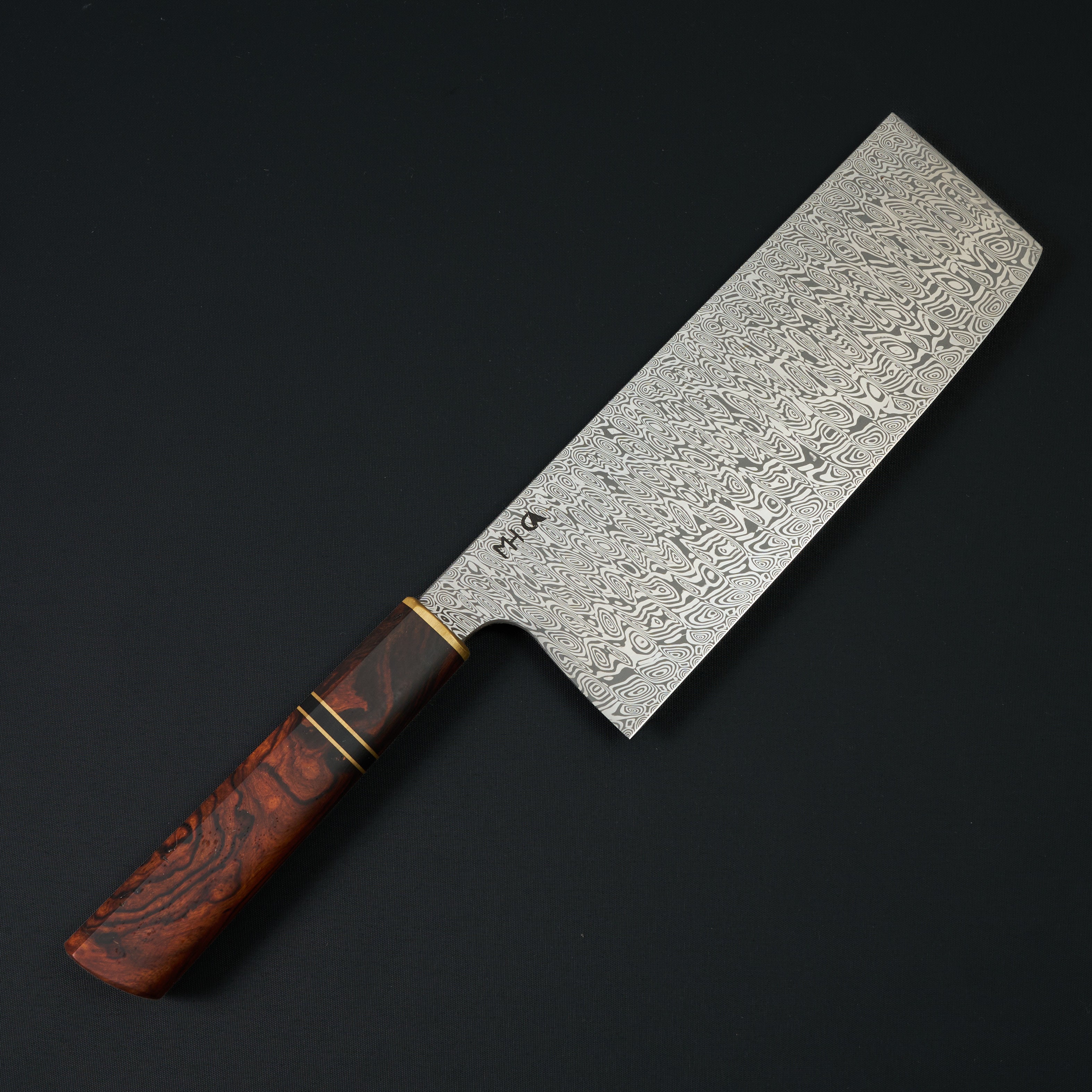 Forged from Damasteel, the blade benefits from advanced powder metallurgy, delivering outstanding edge retention, high toughness, and true stainless performance. Hardened to approximately 63 HRC, Damasteel allows for an exceptionally refined edge while remaining durable and corrosion-resistant in demanding daily use. The blade is finished with an acid-etched forced patina and satin polish, adding depth and subtle visual character without distracting from the knife’s intent. Completing the piece is a rokkaku hanmaru handle with a faceted top and softly rounded underside, a hidden tang construction in richly grained ironwood with patinated brass bolster and accents. In hand, the knife feels robust and well balanced, yet nimble and deft—an expressive, highly resolved Nakiri built for serious, intentional use.