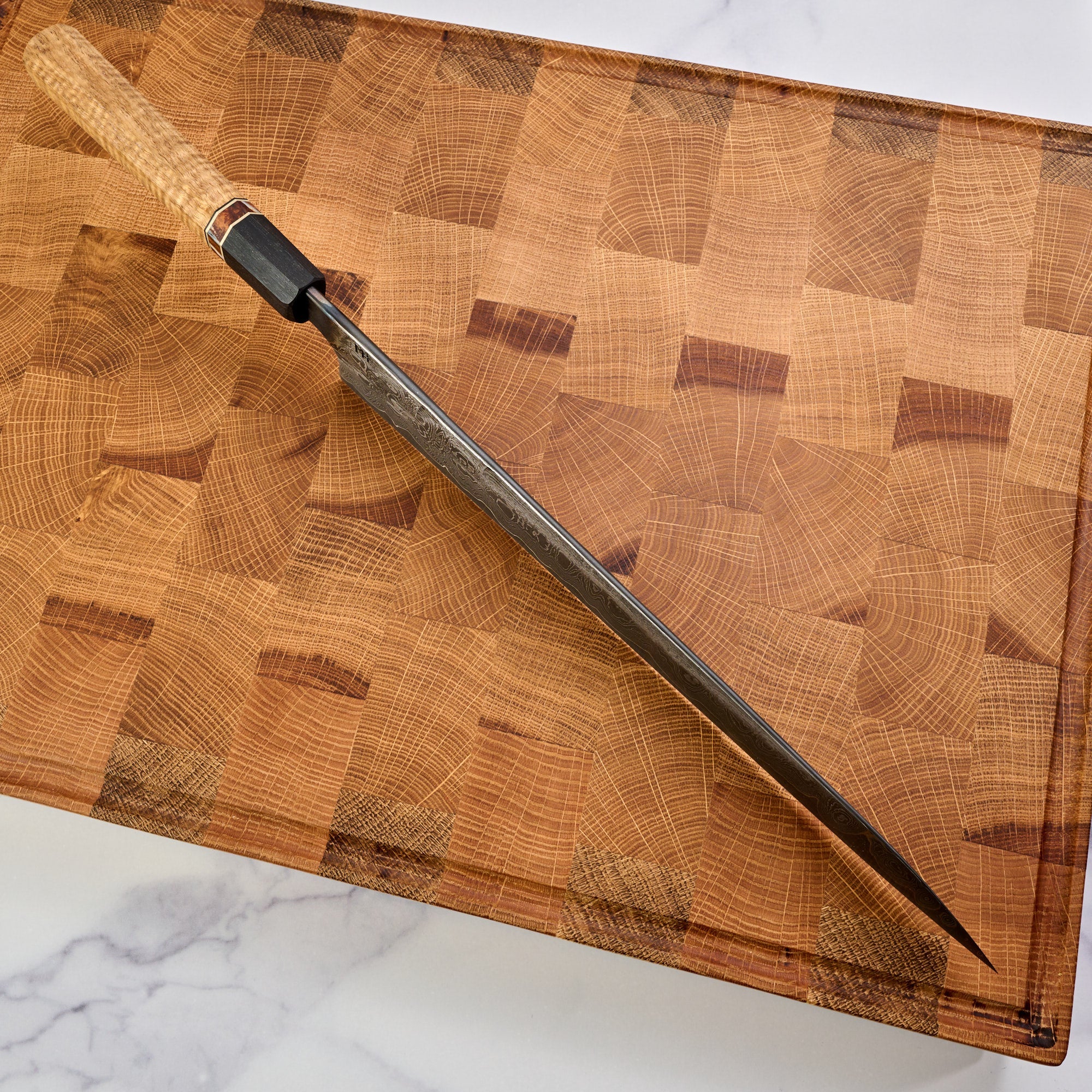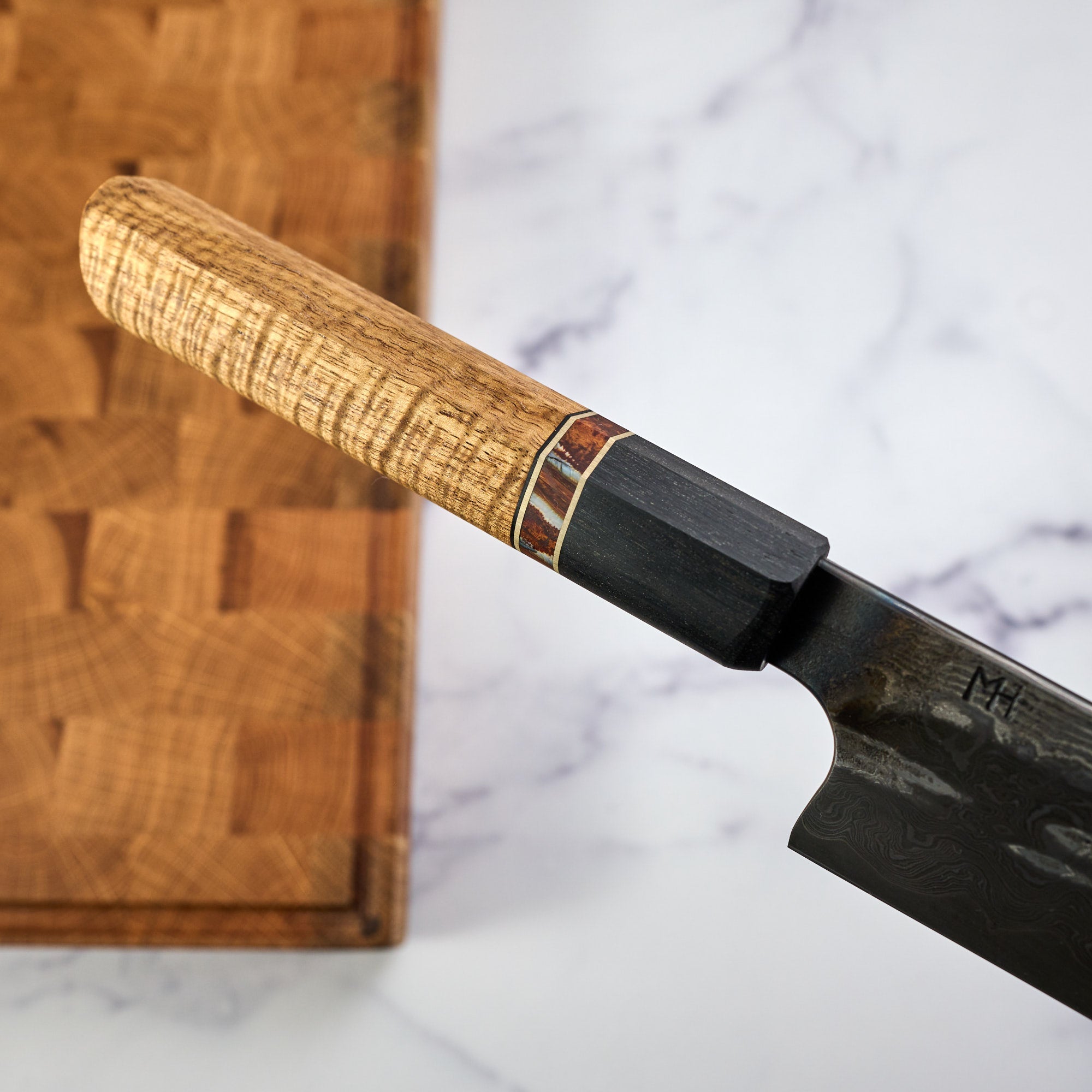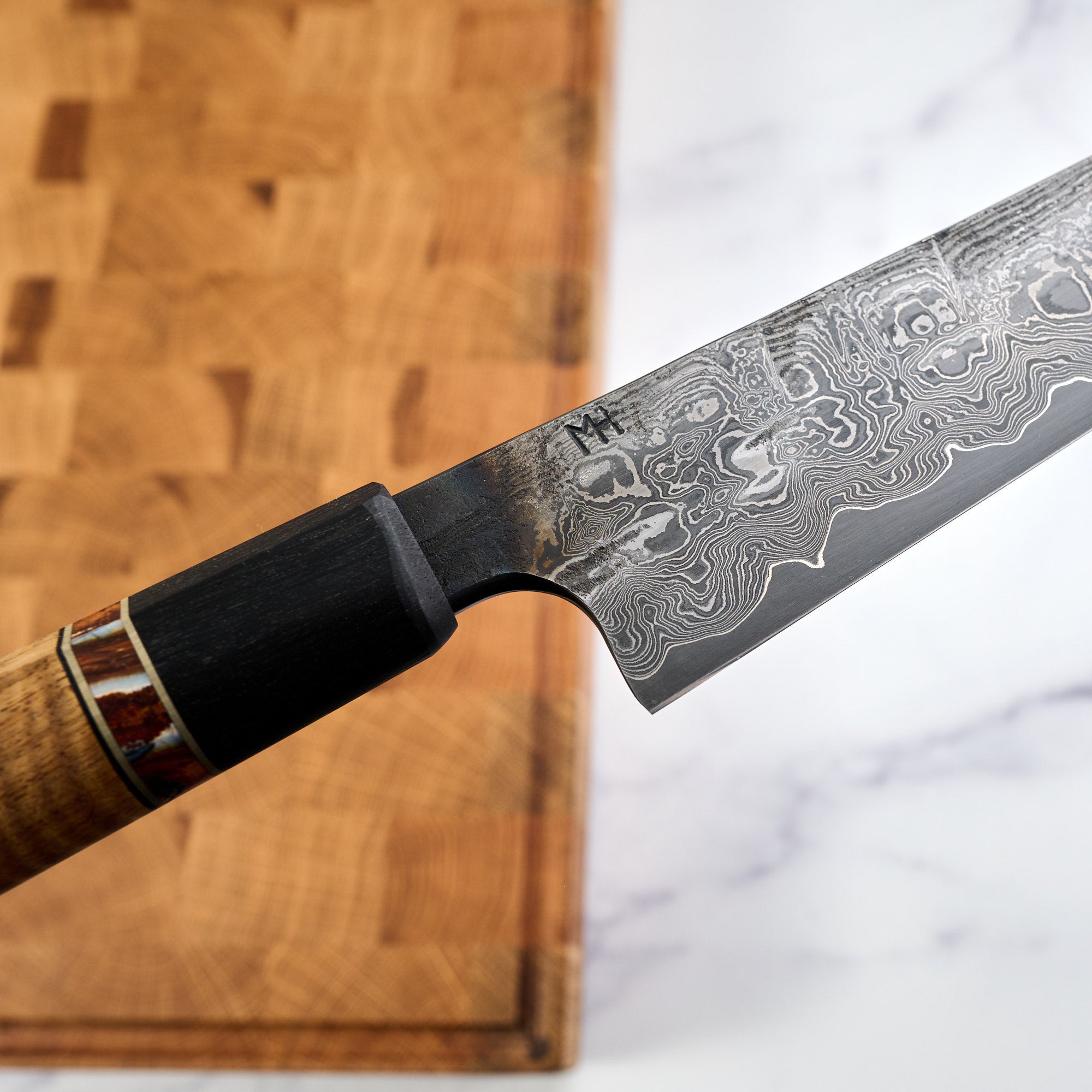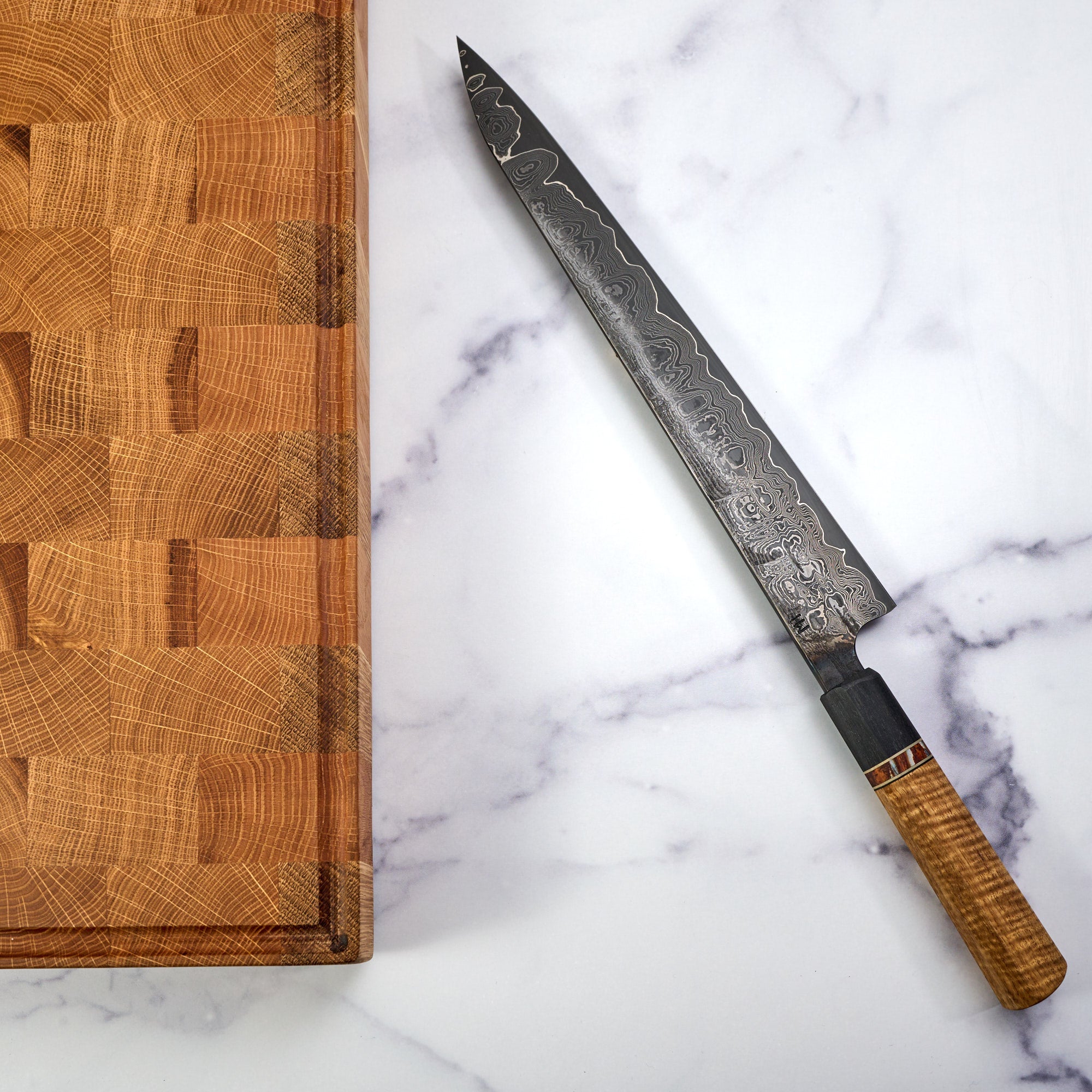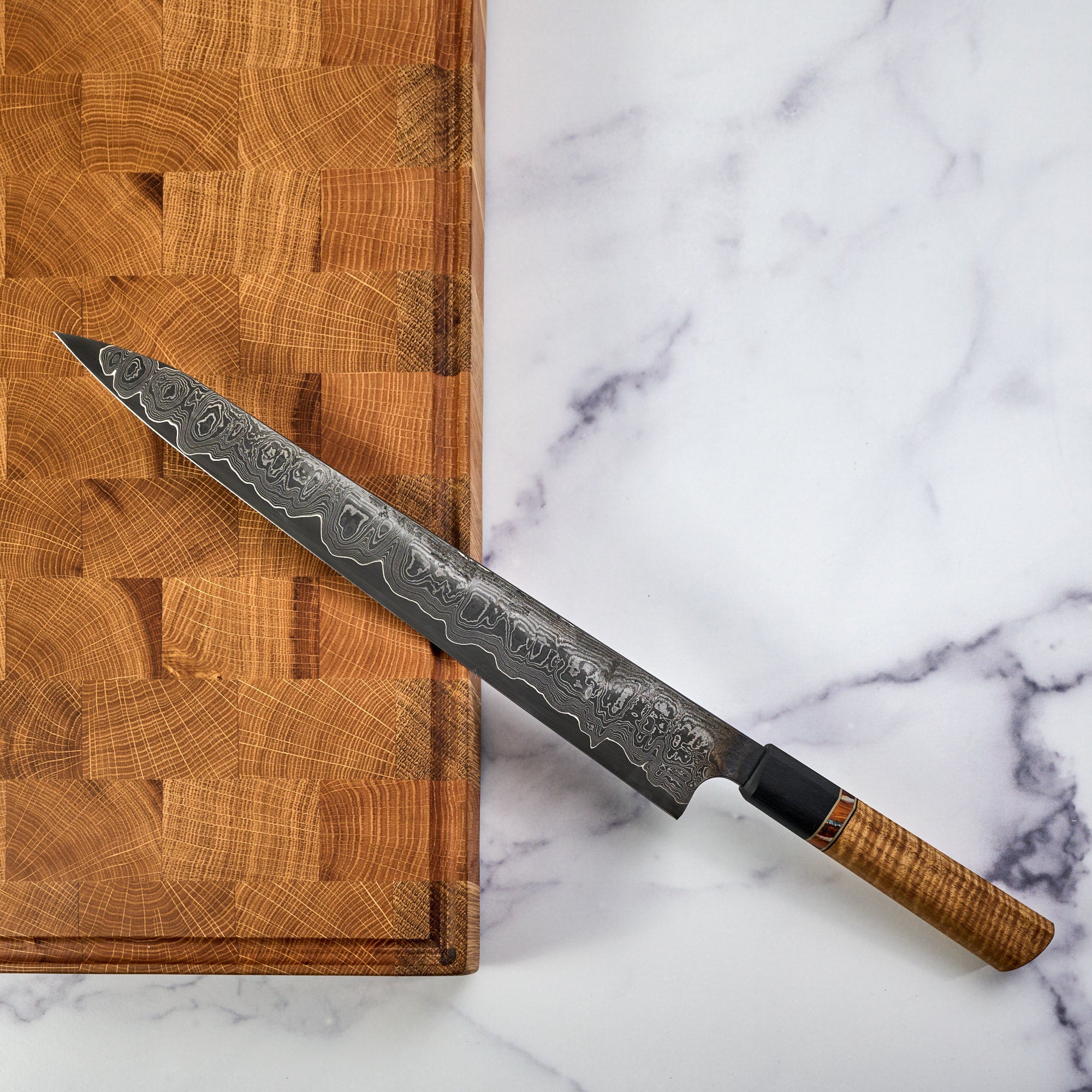 Paired with a beautiful piece of stabilized curly Acacia, with a Mammoth molar spacer, nickel inlays and a Bog oak ferule. The grip is a beautiful work of art itself and the two together make one of the most beautiful Sujihiki we have seen.