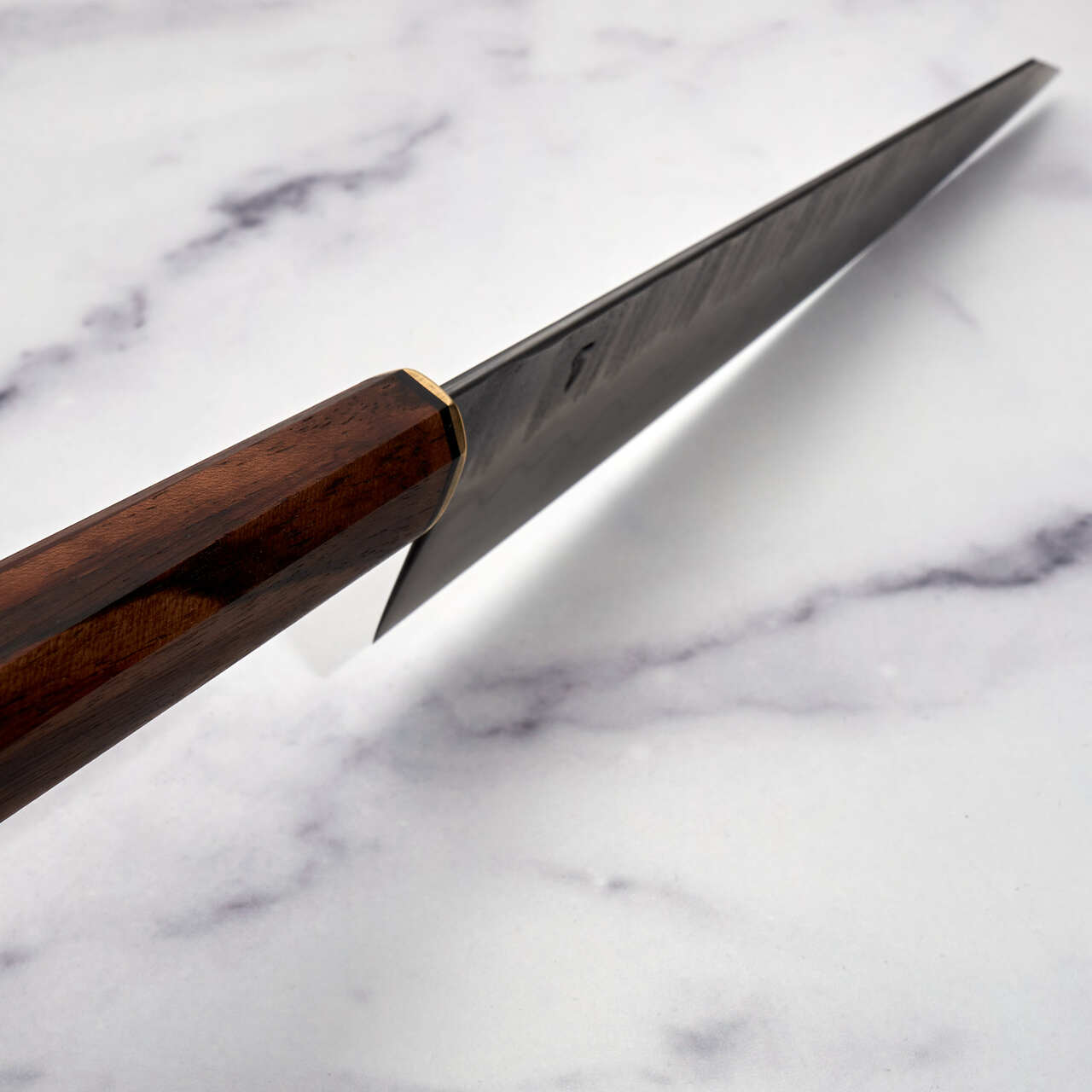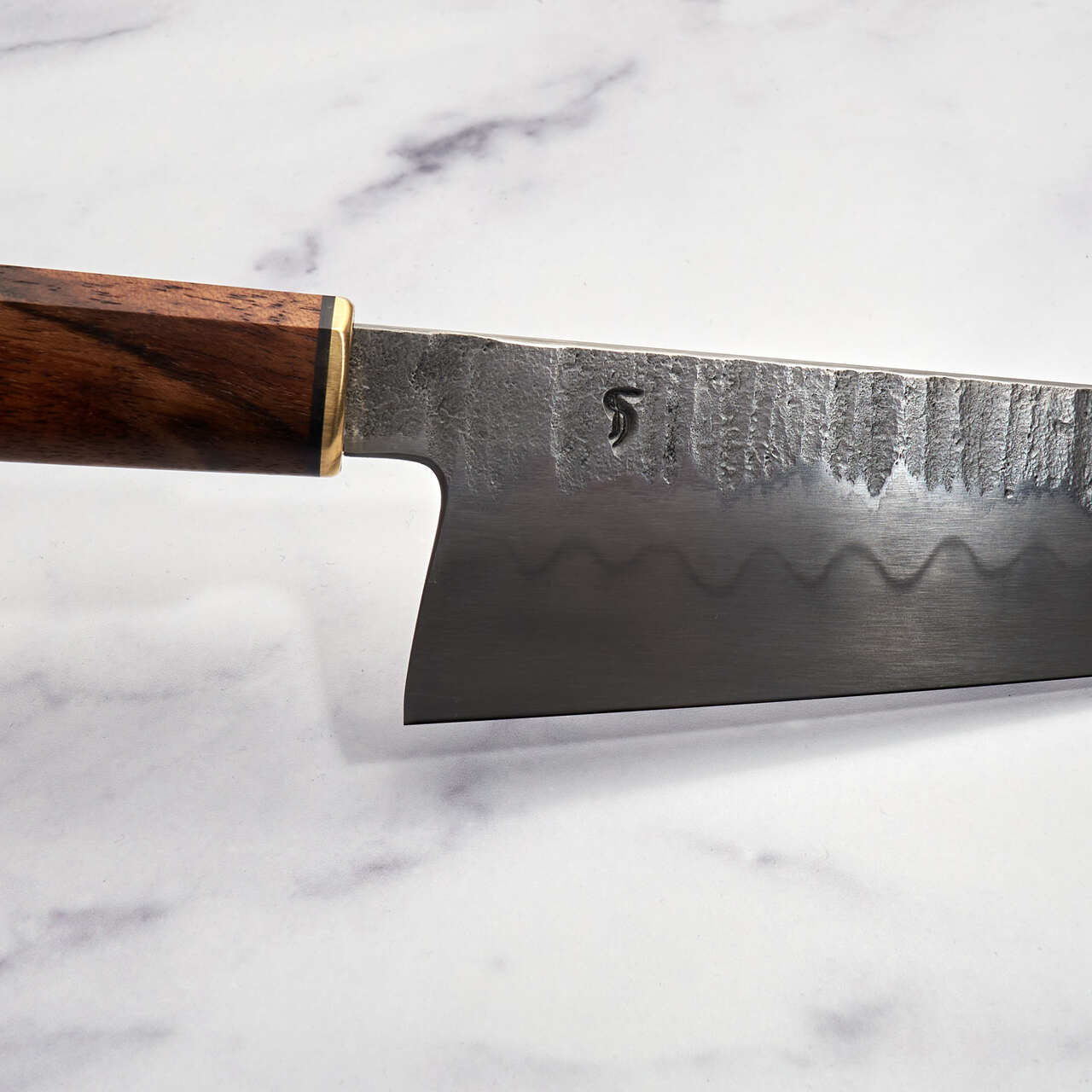 Like our previous collaborations with Fredrik Spåre this edition features the Rokaku Hanmaru or hex/round handle shape. The angled shoulders provide the perfect tactile feedback for orienting the blade and the round under side is comfortable in the hand. A rich walnut has been paired with the classic Fredrik Spåre, hammer dented brass bolster.