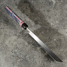 An air gapped seal joins the tang with the handle demonstrating once more Skye’s skill as a craftsman. The handle itself is a frame construction, octagonal, hidden tang design. Made up of stabilised Cottonwood, white G10, stabilised Hawaiian Mango, and African Blackwood the result is a unique and beautiful masterclass in carpentry and joinery.