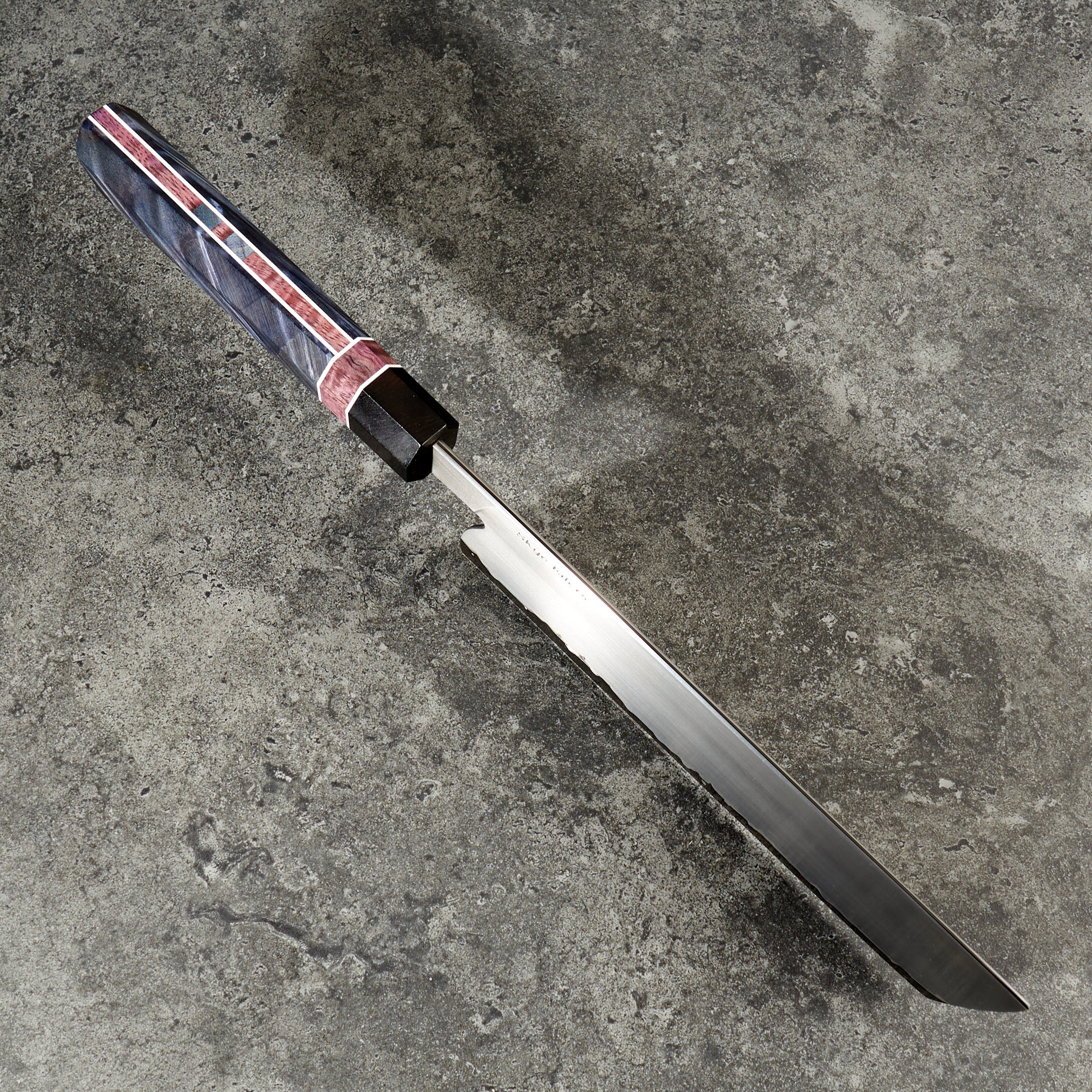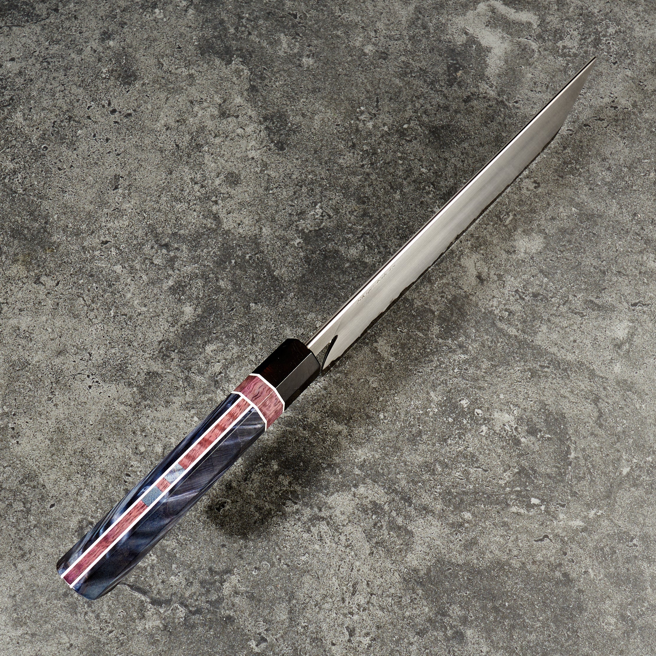 In every detail of this knife Skye demonstrates a broad variety of impressive skills. From the clean, even high-performance convex grind and detail work around the riccaso to the incredible fit and finish of the octagonal frame handle. Each element has been perfectly executed.