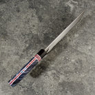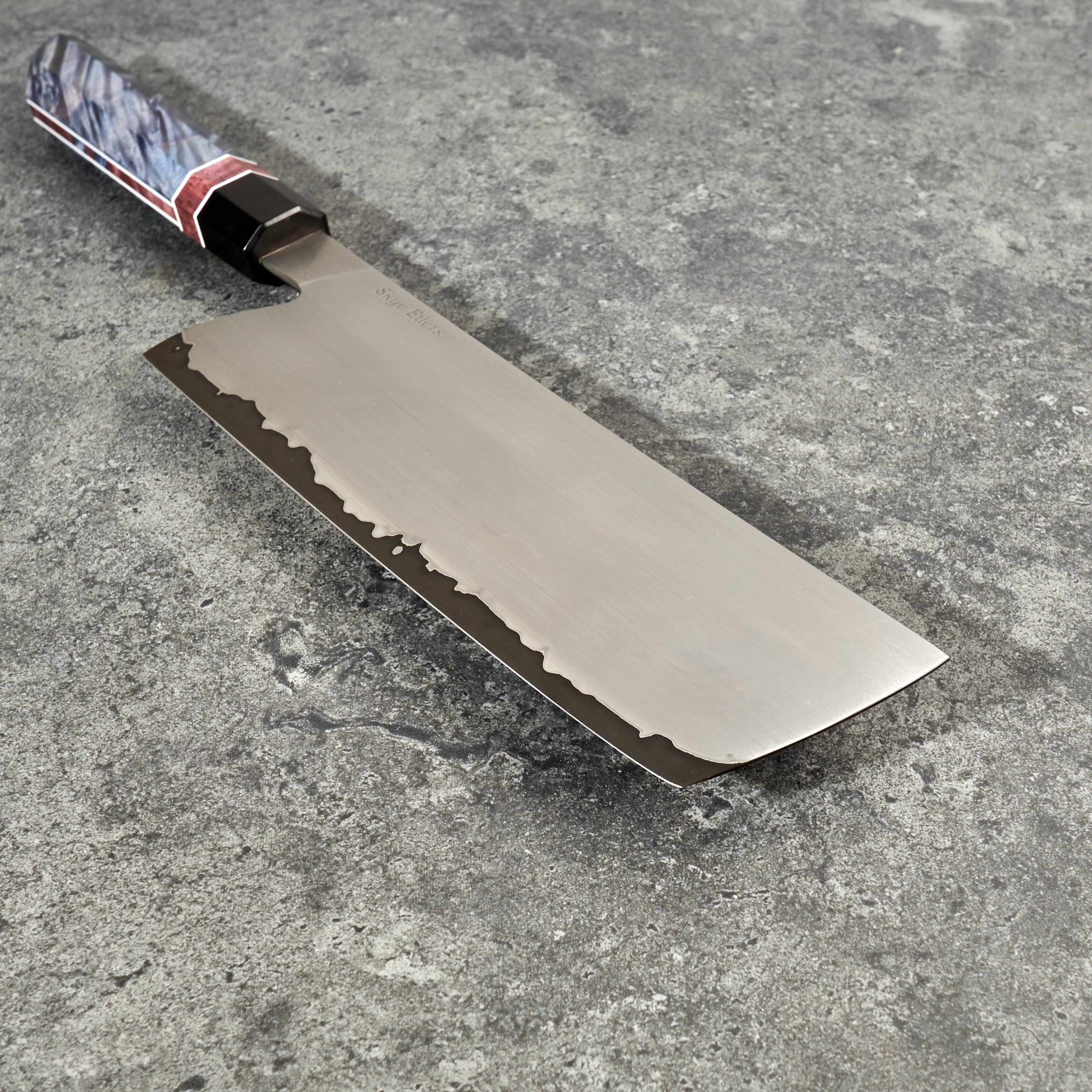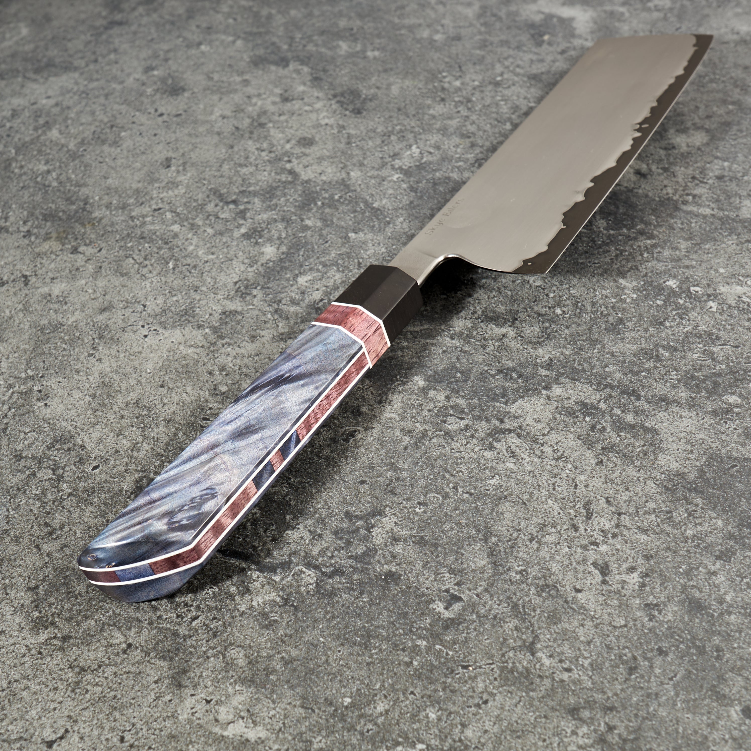 Hand sanded satin finish stainless steel envelops the Vtoku2 carbon steel core with its pitch black, coffee etched forced patina. A subtle nashiji texture around the riccaso completes the finish on the blade.  Looking to the grind the knife features a slight distal taper on the spine, which averages at around 2.5mm. Ground convex and with a razor-sharp edge the knife will perform incredibly well. The profile is very classic and clearly inspired by its Japanese origins.