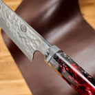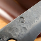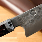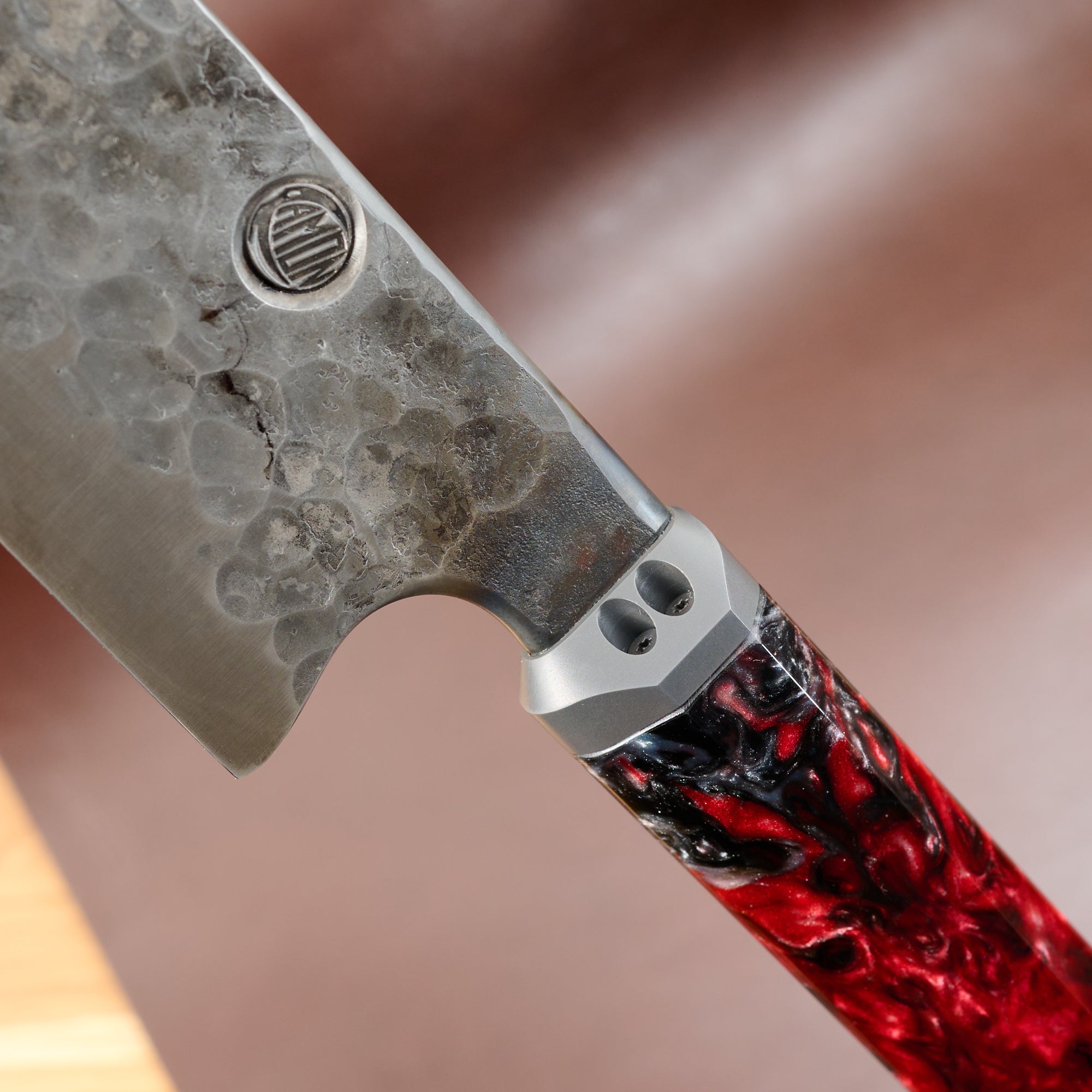 The blade features Kamon’s “Denty” texture and has been acid etched for that blackout look. Reaching back to hex/round Rokkaku Hanmaru handle you will find black titanium “Torpedo” endcaps and a stunning piece of red-black metallic Huberite™️. Shimmering in the light, the handle is a beautiful contemporary pairing with the dark, edgy looks of the precision forged blade.