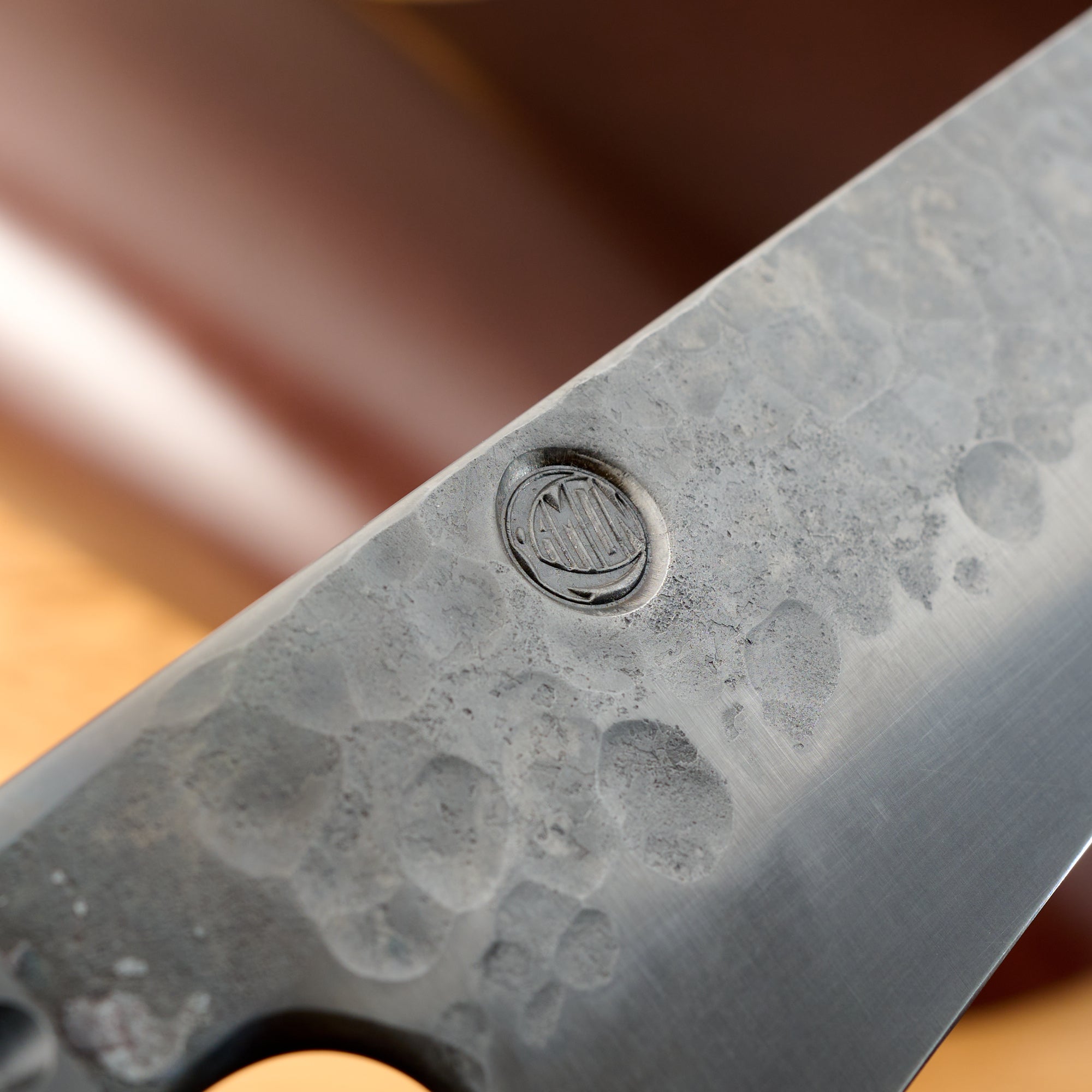 The blade is forged from 1.2519 tungsten alloyed high carbon steel. If you know your steel, then you can consider this 52100++. The addition of tungsten and additional carbon makes this steel that little bit extra. If you don’t know your steels then take it from us, it’s some of the best steel around. Hi-tech hardening processes including fluidised sand and cryo treatments mean that the 1.2519 steel has a very refined grain structure, making it tough, and high hardness (65HRC) for a razor-sharp edge.