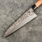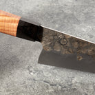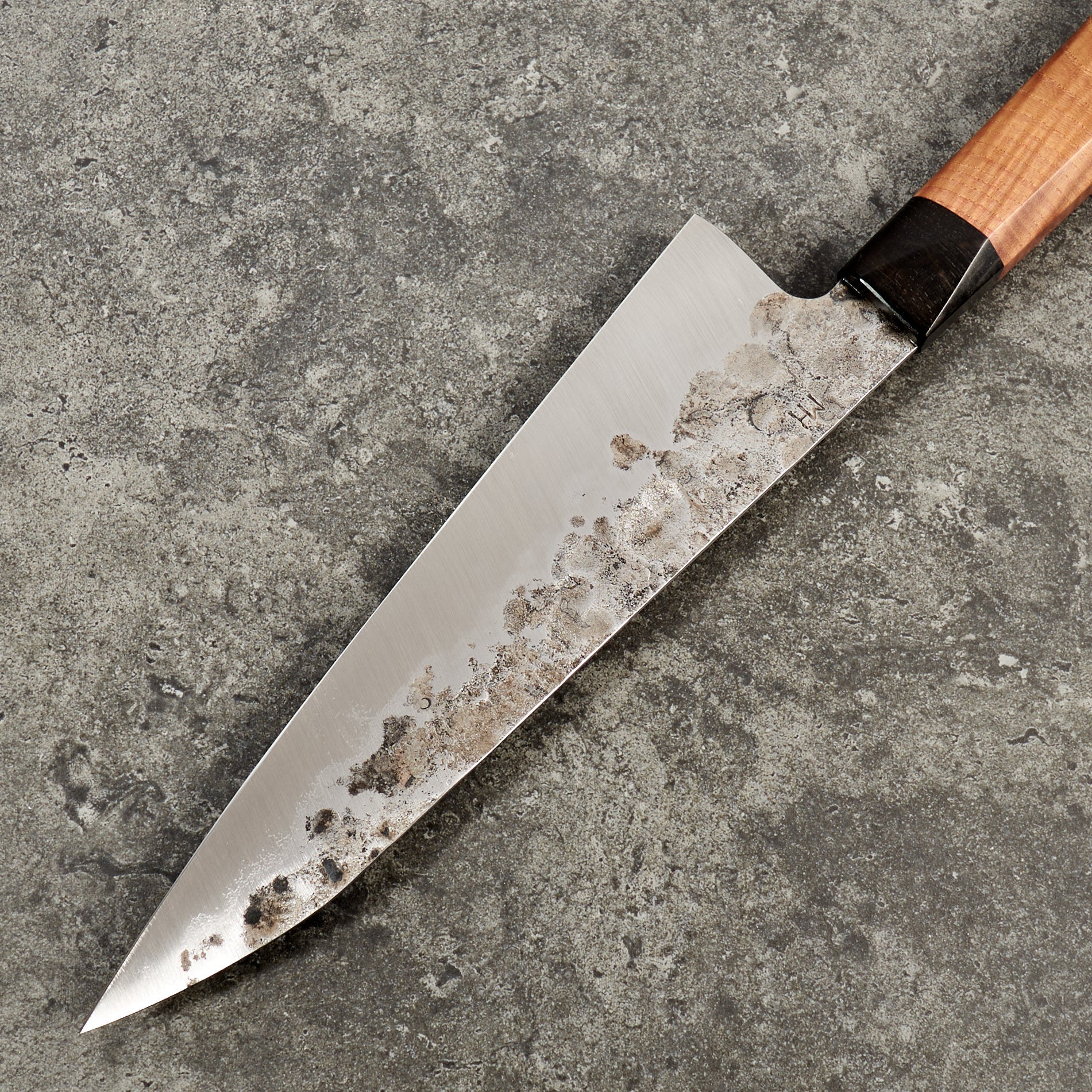 Forged from C100S steel and hardened to around 62HRC, the blade is thin and tall with a lovely thin edge and convex bevel. Above the heel the spine is just 2.4mm and tapers down to approximately 1.3mm as it hits the grind. A very clean Gyuto profile with hybrid Santoku-k-tip.