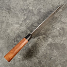 The handle is Martin’s classic tapered Rokkaku Hanmaru screw fastened design and features very clean lines and perfect fit and finish. Balanced beautifully and very comfortable in the hand the knife a subtle piece of work that highlights Martin’s skill as a craftsman and bladesmith.