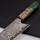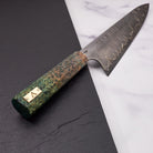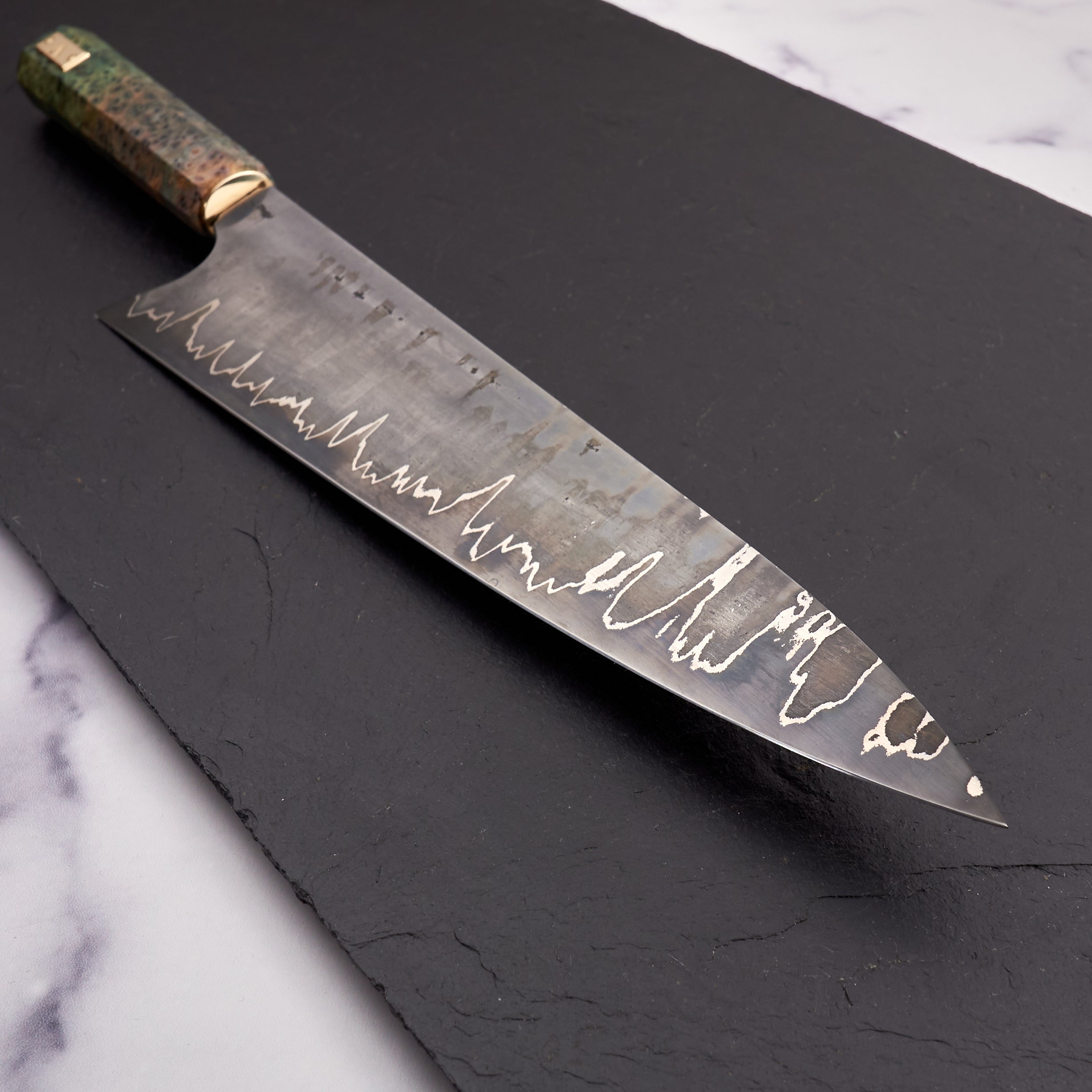Antoine Kniemen does some of the most unique and beautiful work around, each piece more exceptional, more beautiful than the last. This stunning Gyuto features an incredible wrought iron cladding that evokes water flowing over glass on a summer’s day. Wrought iron has such a natural texture and pattern to it, which combined with the high gloss polish on the blade likely inspired the name, “Organic Shimmer”.