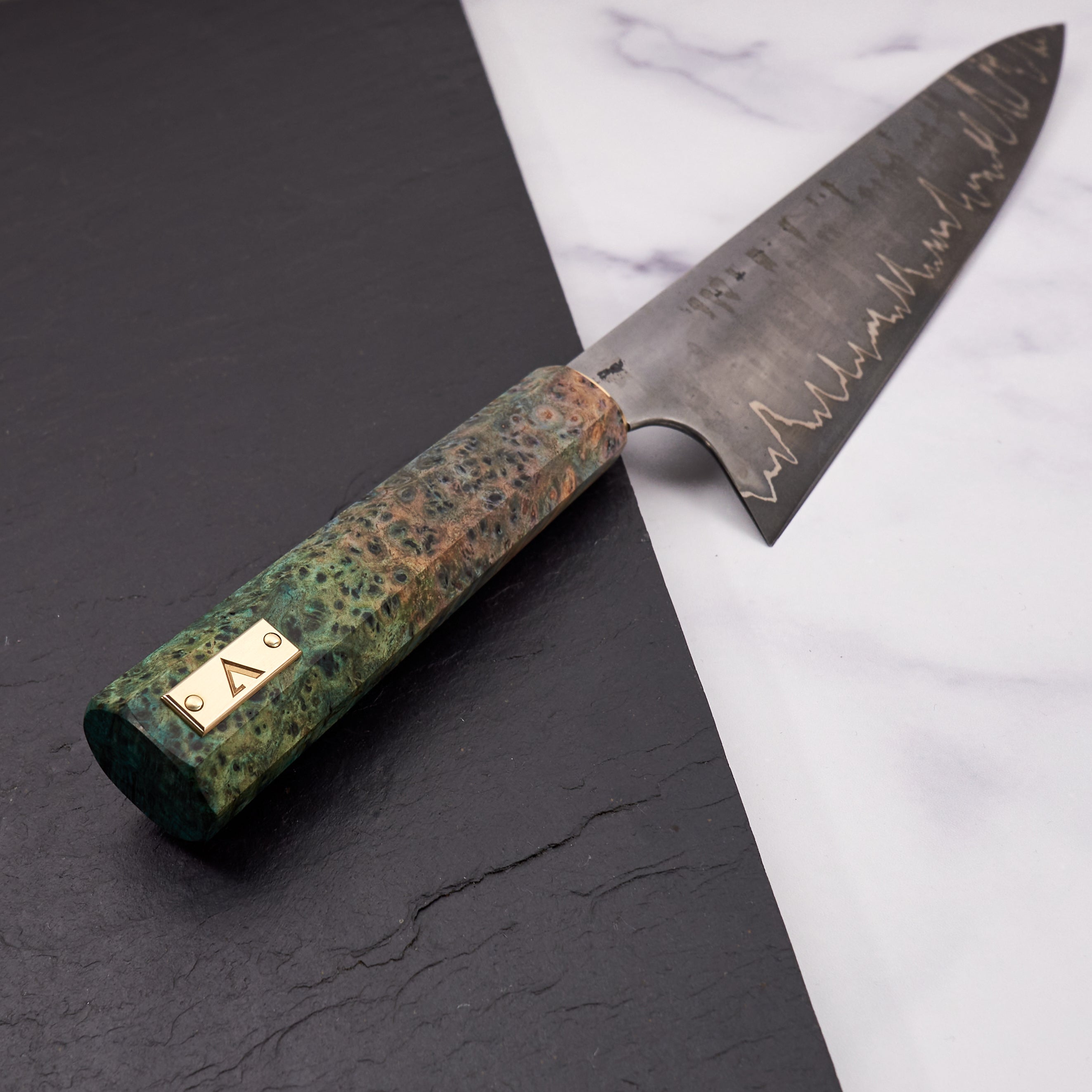 Blade Finish: Brute de Forge, Acid Etched (Forced Patina), and Mirror Polish