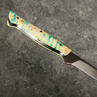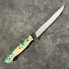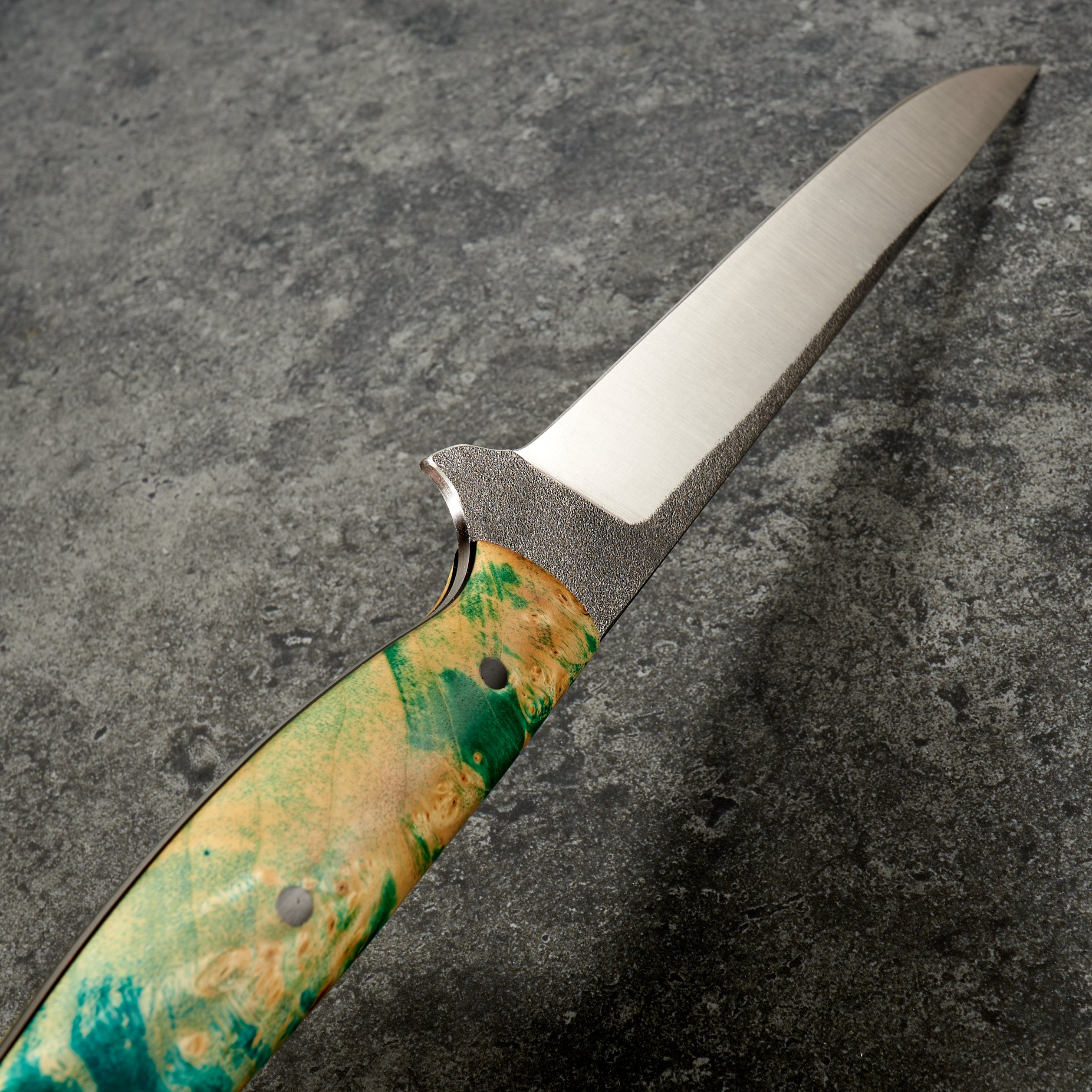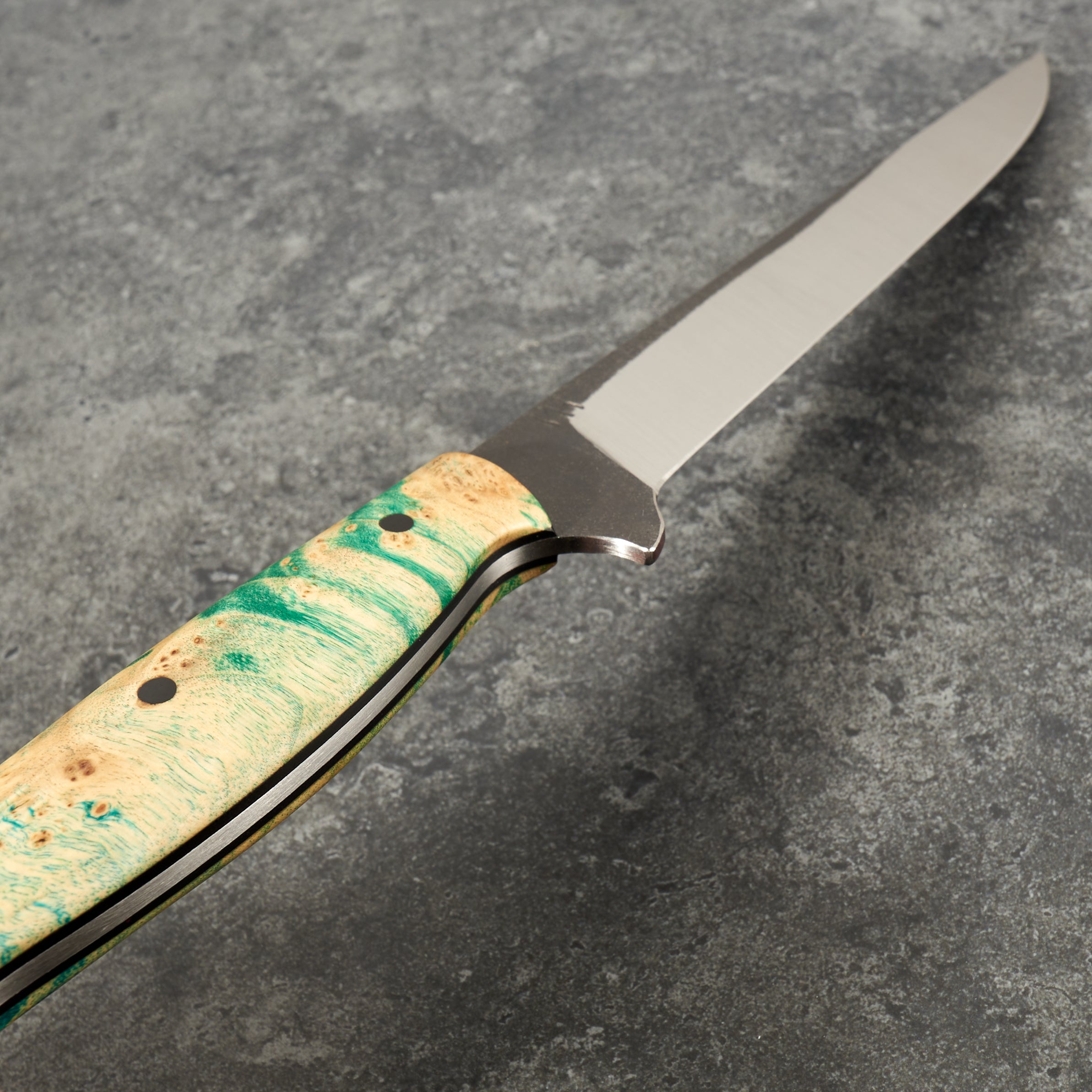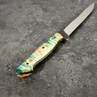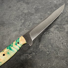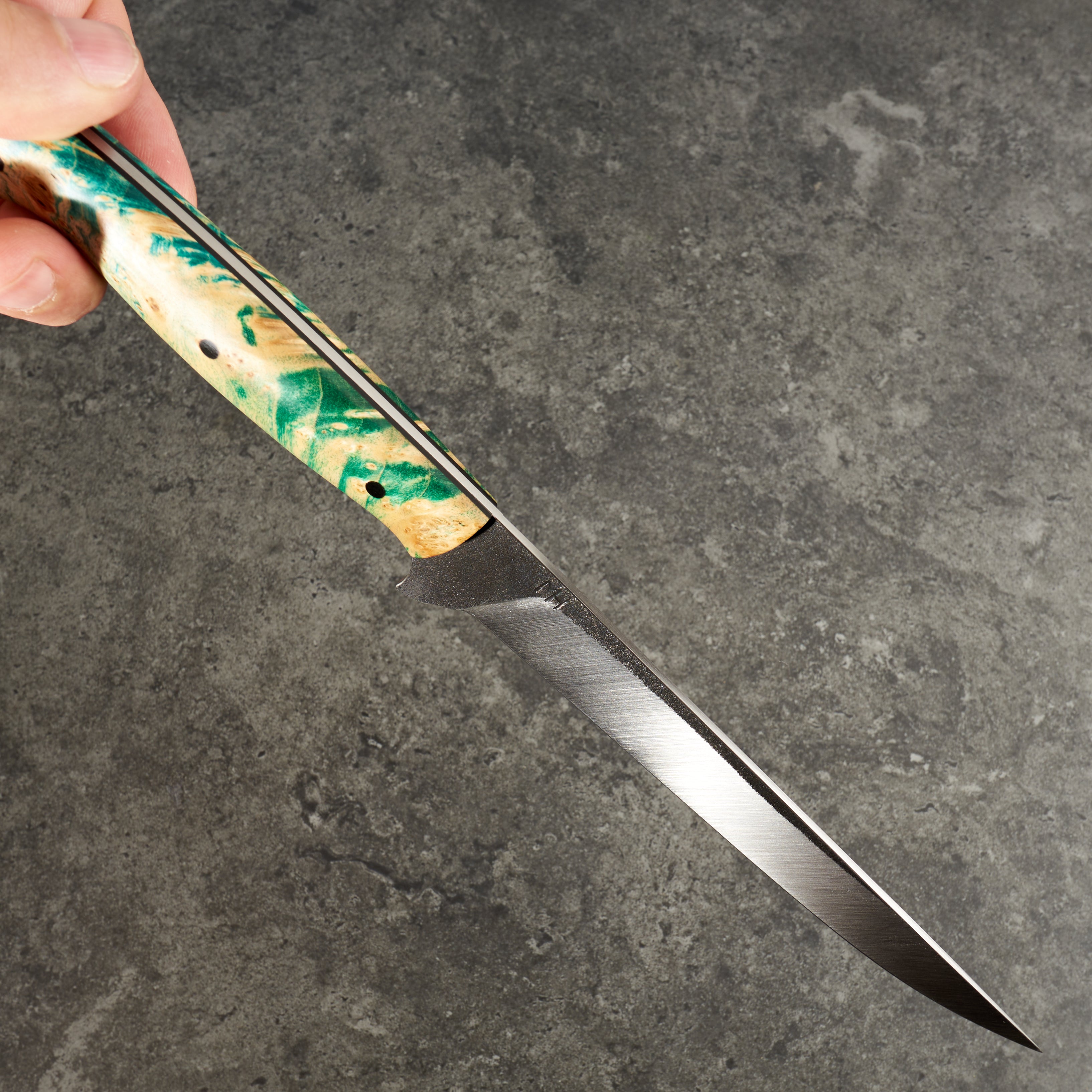 With a satin finish on the blade, a touch of kurouchi along the spine and a vibrant and cool yellow and blue dyed and stabilised maple burl handle this is just about the coolest filleting knife we have come across. It feels dialled in and its going to perform well. If you are in the market for a high performance filleting knife with a tonne of style this is likely to make you happy.