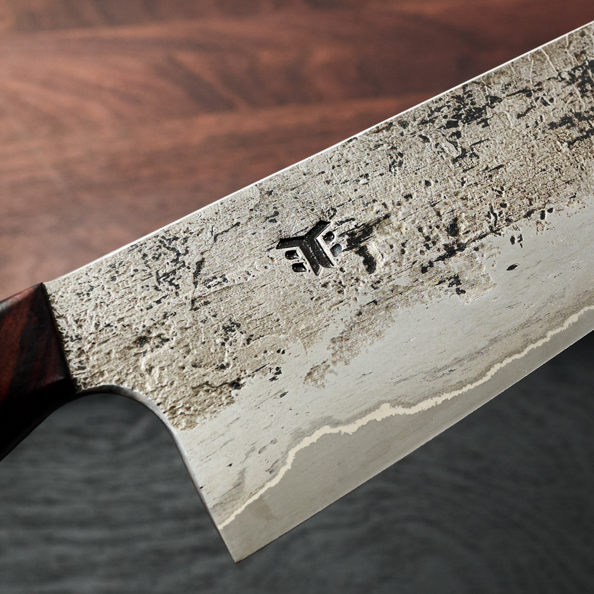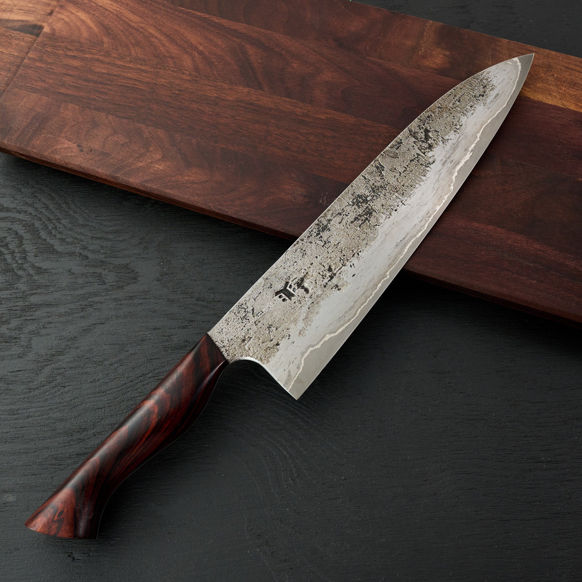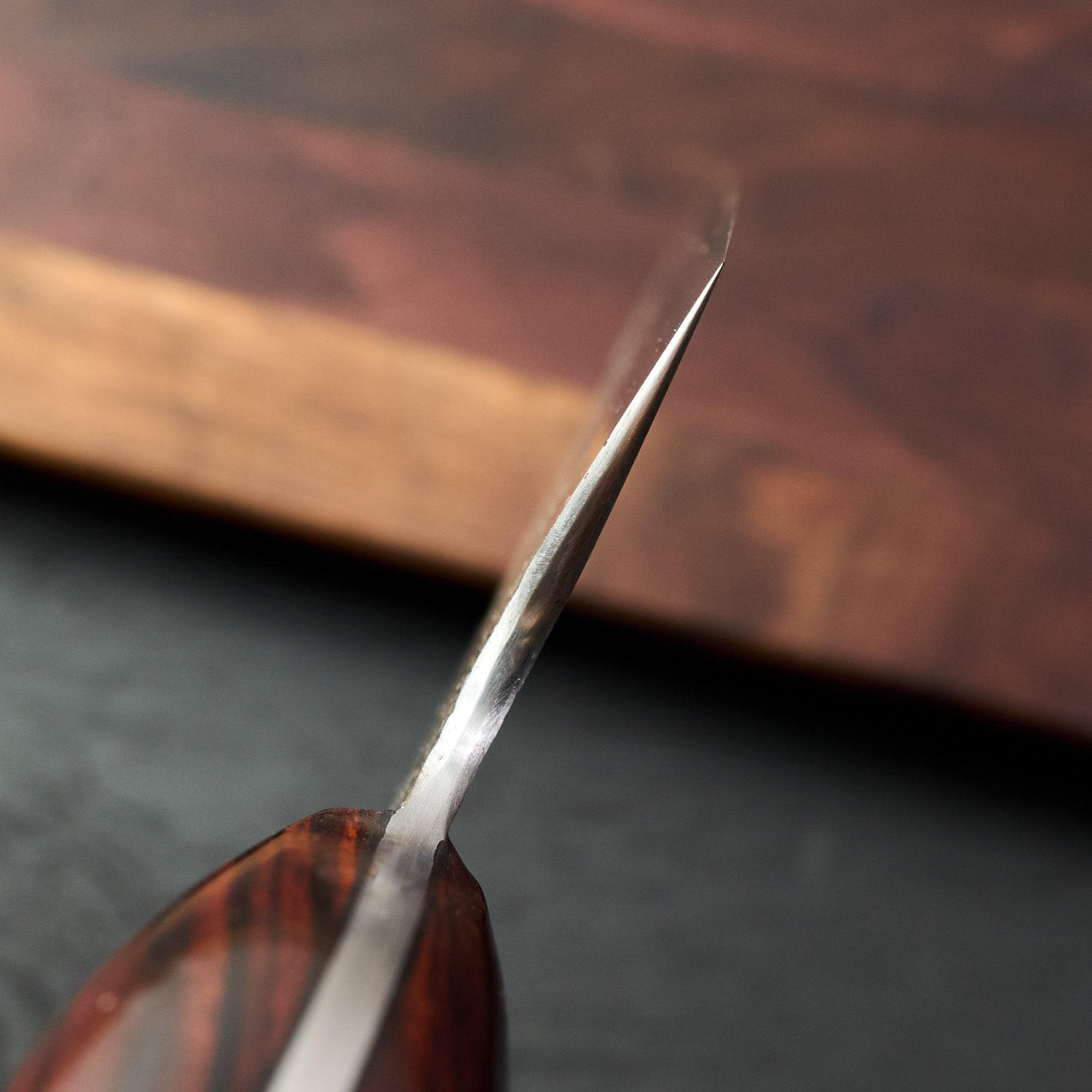 The Gyuto chef knife is the Japanese version of a western style chef’s knife. The blade is different in several ways, which give it different cutting characteristics to the western version. Gyuto blades have a flatter profile which lends itself to more of a chopping and slicing action. The western version features a more curved profile, which is great for a rock-chop style. Like the chef knife the Gyuto does have a curve in the blade, but it is less extreme. So, the Gyuto can also be used in a rock-chop style. Japanese Gyutos also have a thinner blade. So, unlike the western chef’s knife, the Gyuto is not made for cutting through joints in meat or hard material like frozen food. However, this does mean that these Japanese chef knives are typically sharper and lighter than the western version.