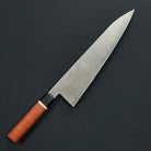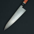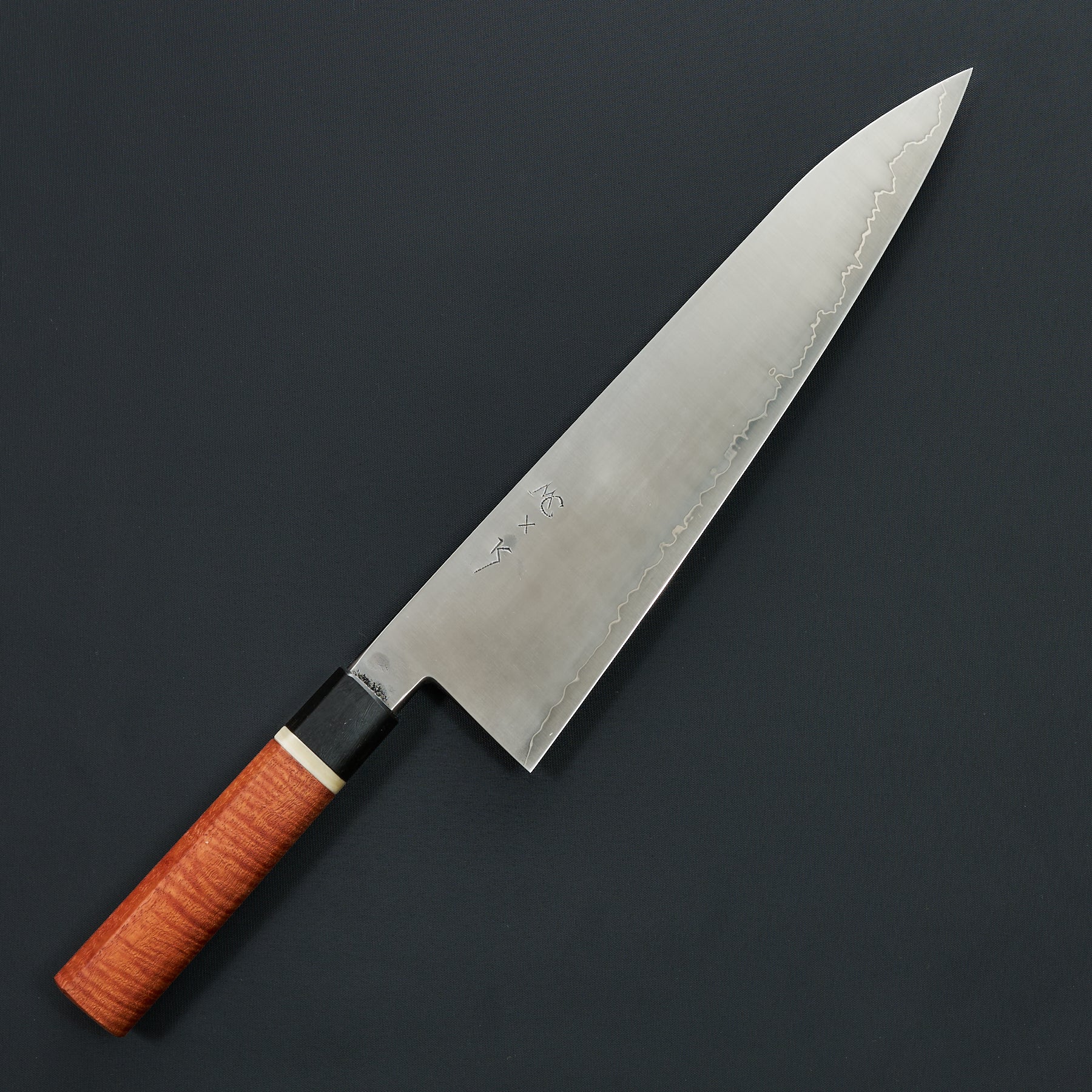 This limited-edition, small-batch Gyuto represents the intersection of modern performance and timeless craftsmanship. Handmade by artisanal bladesmith Simon Krichbaum, this MCx Design Studio collaboration reinterprets the Japanese Gyuto with a distinctly contemporary profile. The blade features an aggressively tapered spine and a finely pointed tip, delivering versatility for precise, agile work. The full grind geometry ensures low drag and excellent food release, with bevels that carry an exceptionally clean, brushed belt finish. Every detail—from the continuous taper to the precise alignment of the grind lines—reflects Krichbaum’s mastery and an uncompromising pursuit of cutting performance.
