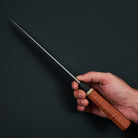 Constructed using a GoMai configuration, the blade combines an Apex Ultra core with stainless steel cladding and a nickel diffusion barrier—a pragmatic yet elegant solution balancing edge retention, toughness, and corrosion resistance. The result is a high-performing, responsive blade that glides through ingredients with remarkable ease. At 192 grams, the knife’s balance point sits comfortably forward of the choil, enhancing control during extended prep sessions. The spine transitions smoothly from a robust 4.25 mm at the heel to a fine 0.97 mm at the tip, producing both stability and precision. The result is a tool that feels alive in the hand—an extension of the chef’s intent rather than an intermediary.