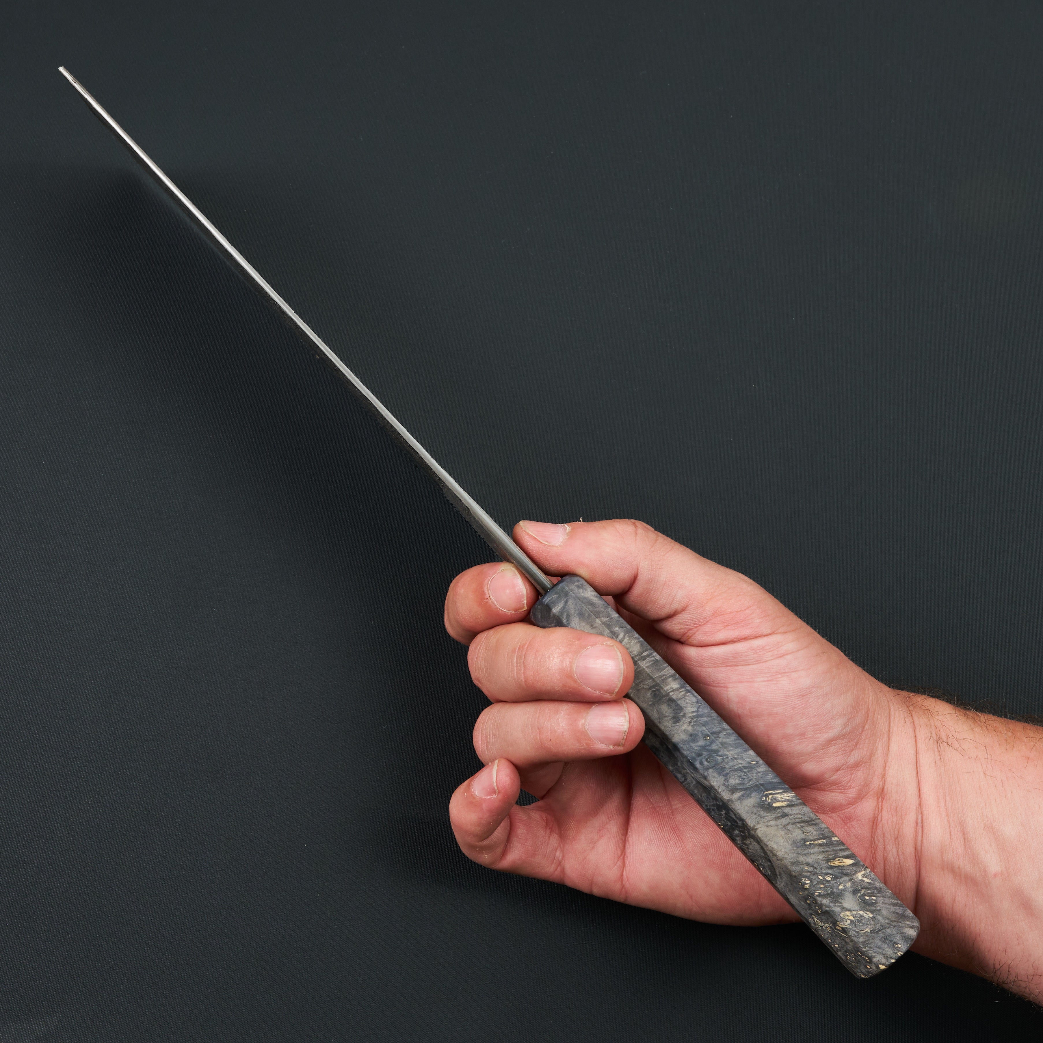 Handle Care: If you have a knife with a non-stabilised wooden handle, you can apply Tsubaki oil or another food safe oil to your handle from time to time. Food safe wax can be applied to both stabilised and no-stabilised wooden handles. Never apply hot wax or oil as you risk warping or damaging the handle.